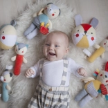 Ce renard doux, fabriqué à la main, est un compagnon idéal pour les bébés dès la naissance. Grâce à ses dimensions compactes, il tient confortablement dans les petites mains, couine et tinte délicatement, stimulant ainsi la perception sensorielle et les capacités de coordination.