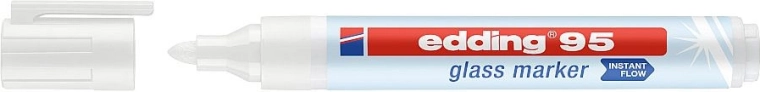 Le marqueur pour verre EDDING 95 en blanc est un excellent choix pour des inscriptions temporaires, des notes et des lettrages créatifs sur des surfaces vitrées et brillantes. Sa grande couvrance garantit une trace bien visible même sur le verre coloré, et son encre à séchage rapide ne laisse aucun film gras.
