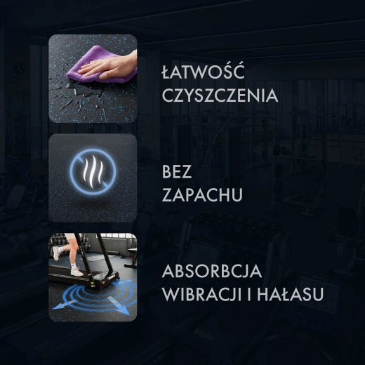 Le sol en caoutchouc POS15 d’une épaisseur de 15 mm assure une protection fiable du support et de l’équipement. Le mélange de caoutchouc recyclé SBR avec 15 % d’EPDM offre une haute résistance aux marques et à l’abrasion, tandis que la surface texturée et antidérapante garantit la sécurité lors des exercices dynamiques. Les particules colorées d’EPDM en noir‑bleu cachent les salissures et conservent un aspect moderne même en cas d’utilisation intensive.