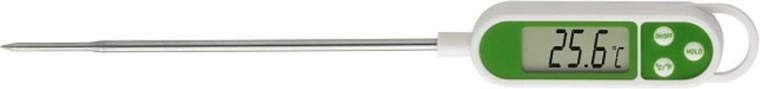 Pratique et précis, le thermomètre à sonde numérique TFA de couleur verte est idéal pour le contrôle rapide de la température des aliments et des boissons – de la pâtisserie et des préparations pour enfants jusqu’au vin, à l’huile ou aux masses chocolatées. Il offre une large plage de mesure de -50 à +300 °C, une sonde de 140 mm et est conforme à la norme HACCP pour la sécurité alimentaire. La fonction arrêt automatique économise la batterie.