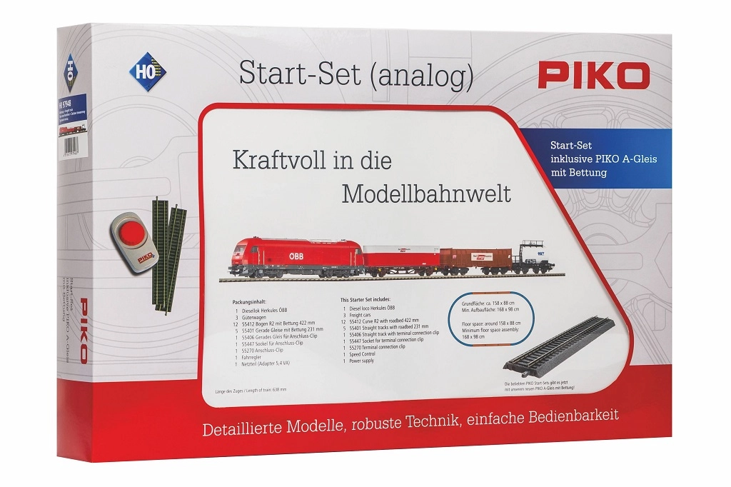 Coffret de modélisme complet de PIKO à l’échelle H0, contenant tout le nécessaire pour rouler immédiatement : locomotive diesel ÖBB Hercules, 3 wagons de marchandises, ovale de voies PIKO A-Gleis avec ballast intégré, alimentation et régulateur analogique. Grâce au montage facile, à la fiabilité de fonctionnement et à la possibilité d’extension et de numérisation (NEM 652), il est idéal pour débutants comme pour modélistes confirmés.