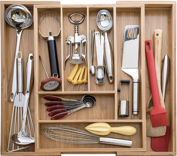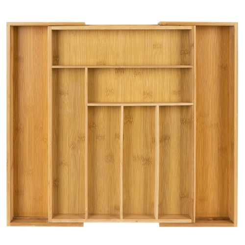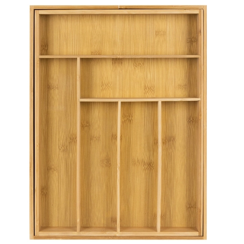 Pratique, l’insert de bois de bambou s’adapte à la largeur du tiroir grâce à ses côtés coulissants. En configuration de base, il offre 6 compartiments, et jusqu’à 8 sections une fois déployé, pour trier clairement couverts et ustensiles de cuisine. Des séparations lisses facilitent l’organisation et l’accès rapide.