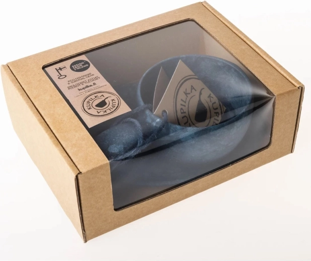 Le set comprend la tasse iconique inspirée de la kuksa finlandaise traditionnelle, une petite assiette et une cuillère à thé – le tout dans une finition bleue uniforme. Les produits KUPILKA sont fabriqués en Finlande, entièrement recyclables et emballés dans un carton recyclé, pour plaire aussi aux adeptes de la durabilité.