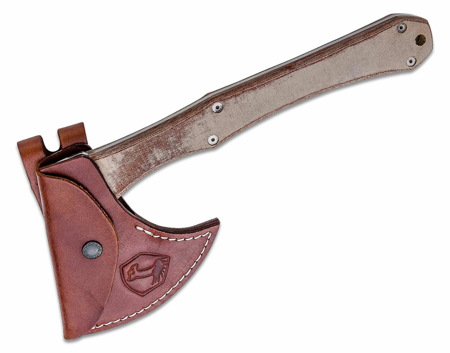 Hache d’extérieur robuste Condor Mountain P.A.S.S. pour le bushcraft, le camping et les travaux exigeants sur le terrain. Elle offre une tête en acier au carbone 1075 avec finition durable, une poignée ergonomique en Micarta assurant une prise sûre et un étui en cuir pour un port en toute sécurité.