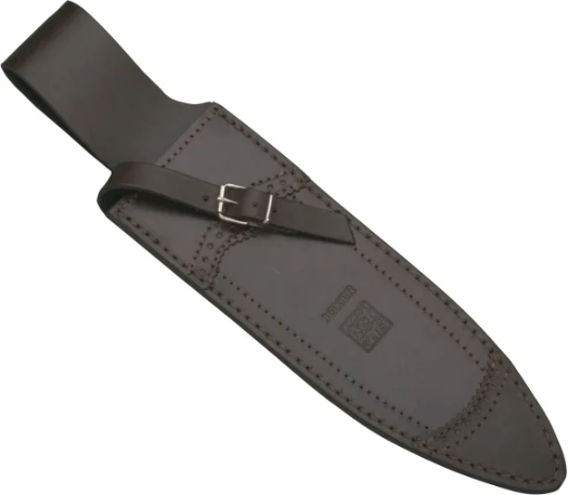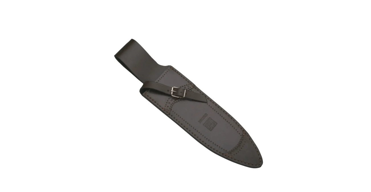 Le manche en véritable bois de cerf confère au couteau une apparence luxueuse et traditionnelle. Le motif sculpté de tête de sanglier à l’extrémité du manche souligne le caractère cynégétique du couteau. La garde métallique du même matériau que la lame protège les doigts et augmente la sécurité d’utilisation. Le couteau est livré avec un étui en cuir pour un rangement et un transport sûrs.