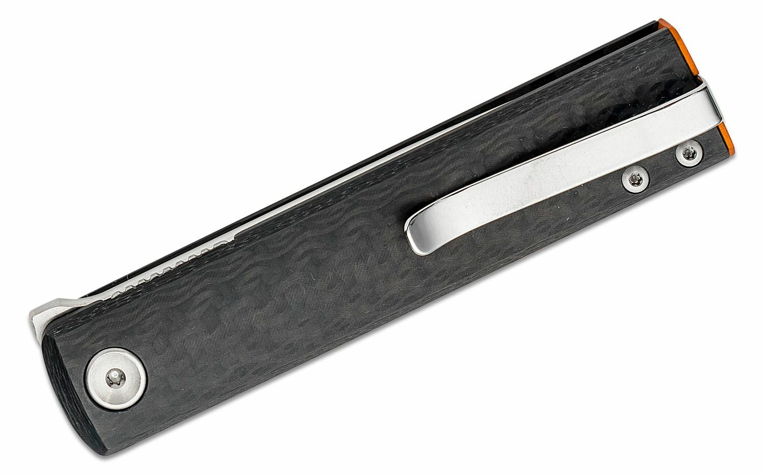 Le manche en fibre de carbone avec insert en aluminium anodisé de couleur orange offre une combinaison parfaite de légèreté, de solidité et d’un look marquant. Le clip de poche intégré permet un port confortable et un accès rapide, faisant de ce couteau l’outil idéal en ville, en randonnée et pour les petites tâches quotidiennes.