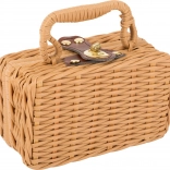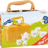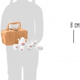 Élégant ensemble café en porcelaine dans une valise en osier avec un motif romantique. Idéal pour les jeux d'enfants lors de pique-niques ou de goûters avec des poupées.