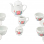 Ce magnifique ensemble café en porcelaine comprend 14 pièces de vaisselle, y compris une grande théière, un pot à lait, un sucrier et quatre tasses avec soucoupes. Tout est élégamment disposé dans une valise en osier avec un tissu à carreaux rouge et blanc. Le design avec des roses ajoute une touche romantique, ce qui rend cet ensemble idéal pour des goûters imaginaires à l'intérieur comme à l'extérieur.