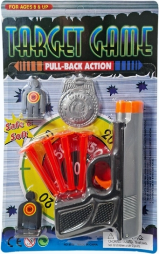 - Tout-en-un – pistolet, cible avec points et badge de police dans un seul emballage.
