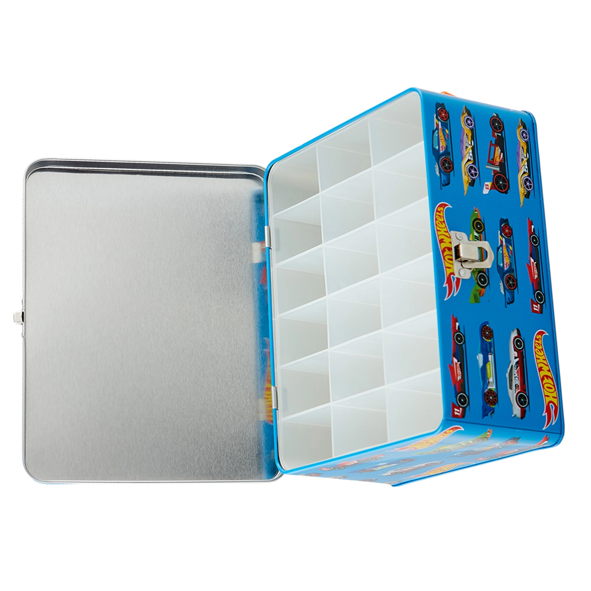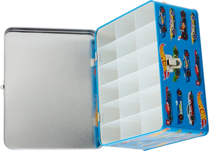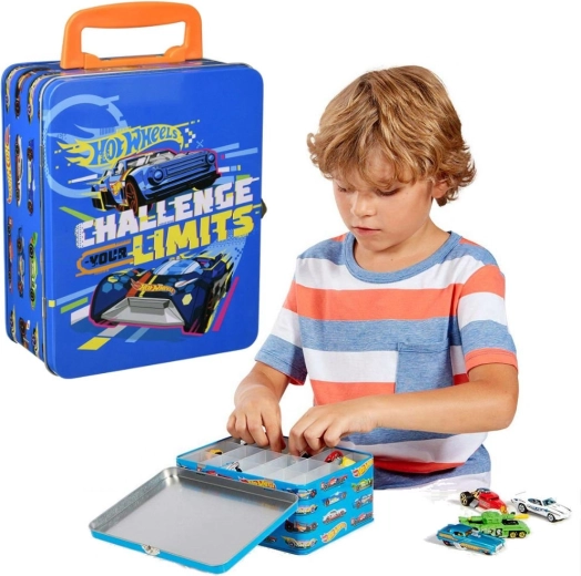 Cette élégante mallette bleue, ornée de graphismes de voitures de course et du slogan « Challenge Your Limits », est une excellente solution pour tous les jeunes collectionneurs. À l’intérieur, vous trouverez une grille amovible avec 18 compartiments individuels qui gardent les petites voitures bien séparées et protégées. La construction métallique robuste et la fermeture à boucle fiable assurent un rangement sûr pendant le transport.