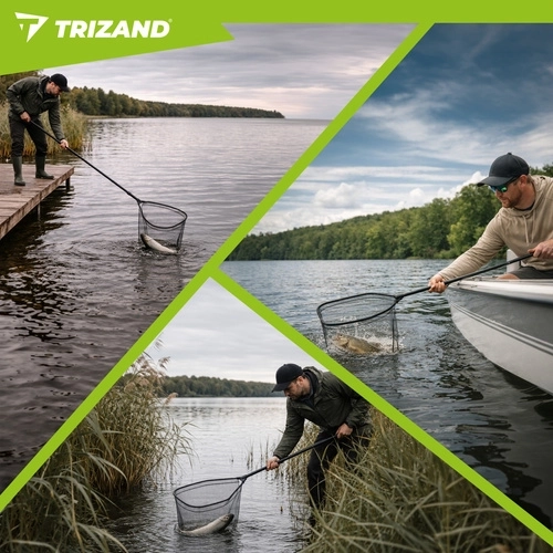 L’épuisette pratique TRIZAND avec manche télescopique jusqu’à 230 cm facilite l’épuisetage sûr des poissons sans les abîmer. Elle possède un filet profond à séchage rapide, un cadre en aluminium léger et robuste, une construction pliable pour un transport facile et une poignée antidérapante assurant une prise sûre par tous les temps.