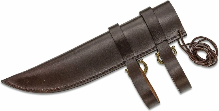 La poignée en bois dur est simplement profilée et légèrement incurvée à l’extrémité pour une prise en main plus sûre et plus confortable. L’étui en cuir avec sangles permet un port horizontal sécurisé et discret à la ceinture, afin que le couteau soit toujours à portée de main.