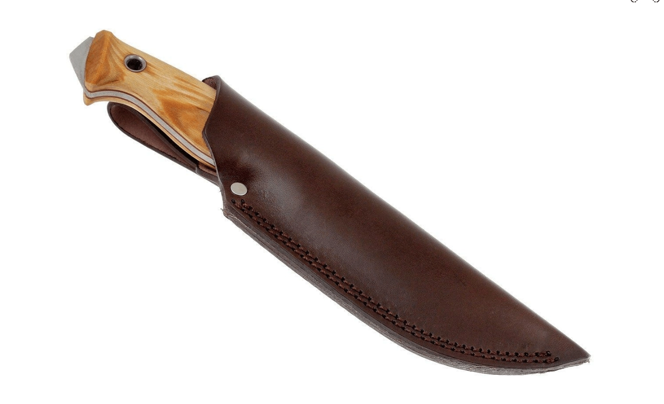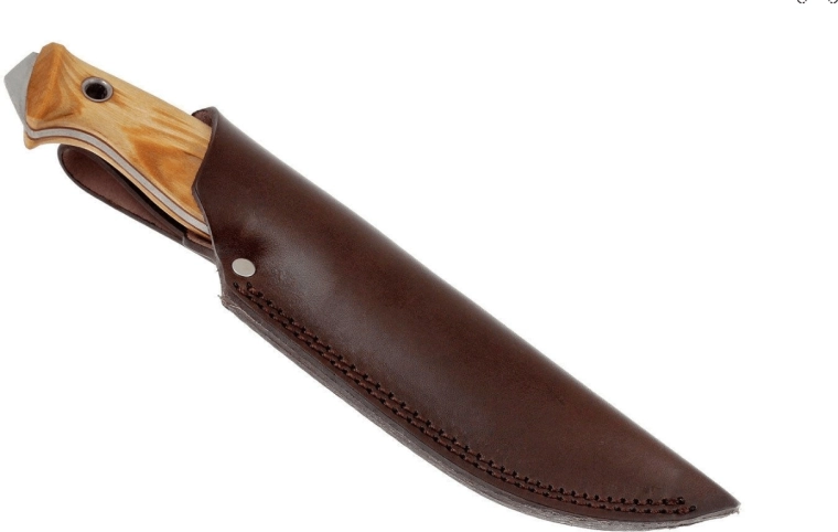 La construction pleine soie (full tang) assure une solidité et une stabilité exceptionnelles lors des tâches exigeantes. Le manche d’une seule pièce en bouleau frisé est poncé à la main, poli et huilé, offrant une excellente prise en main et une esthétique naturelle unique. L’étui en cuir permet un port sûr et élégant à la ceinture.