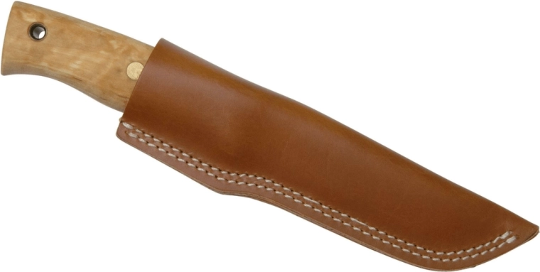 Le manche en une seule pièce de bouleau madré est poncé à la main, poli et huilé, offrant une prise en main remarquable, et chaque pièce possède une apparence unique. L’emballage inclut un étui en cuir de qualité pour un port sûr et confortable à la ceinture.
