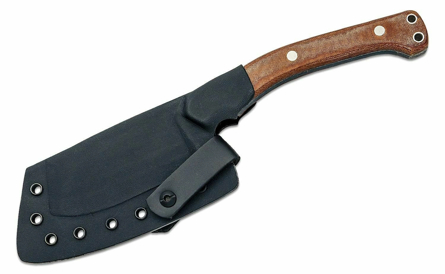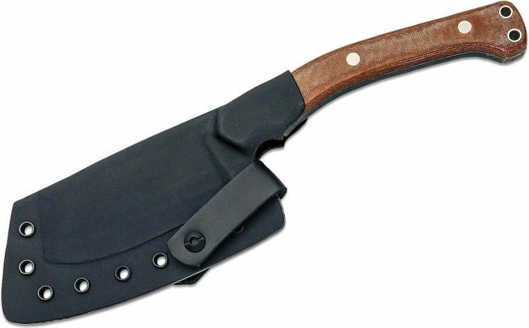 Le manche ergonomique en Micarta de couleur brune tient parfaitement en main, même mouillé, et deux œillets traversants permettent d’attacher une corde pour plus de sécurité. Le couteau est fourni avec un étui rigide en thermoplastique et une fixation ceinture en cuir, pour l’avoir toujours à portée de main.