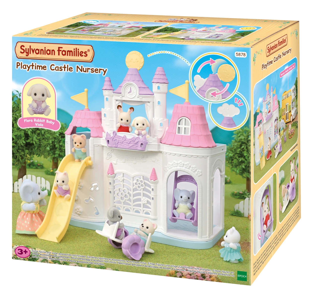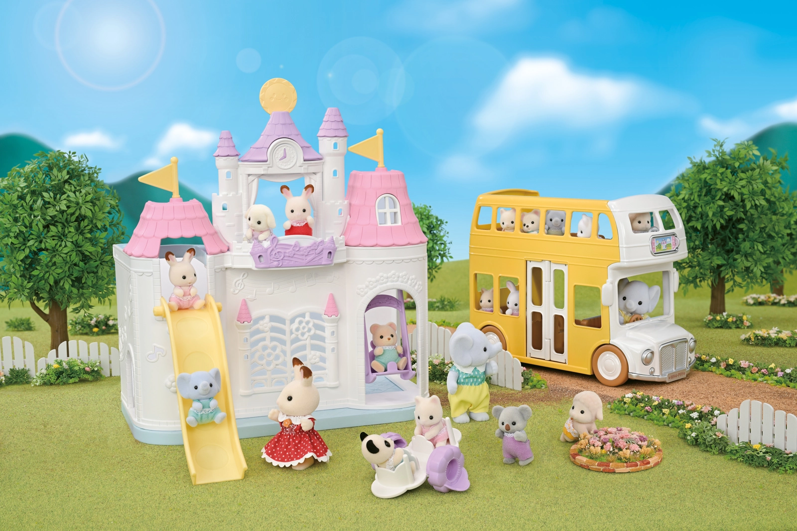 - Maternelle de château (château de jeu), toboggan, balançoire, balançoire à bascule (transformable en table et chaises), accessoires d’intérieur, figurine bébé Flora le lapin