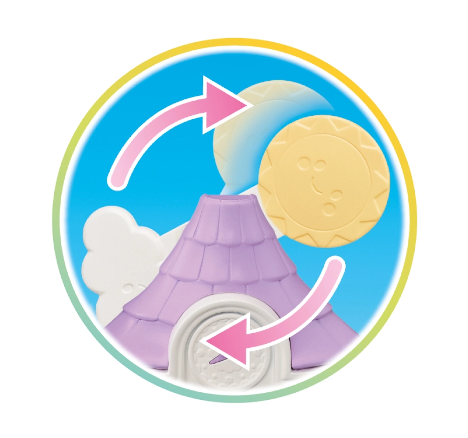 La fonction de changement de météo est unique : alternez entre ensoleillé et pluvieux et déplacez l’arche sur le toit ainsi que les accessoires pour correspondre à la scène du moment. L’ensemble inclut l’adorable figurine bébé Flora le lapin avec membres et tête articulés ; la tenue peut être retirée et échangée.