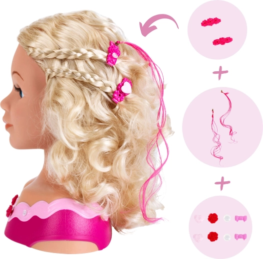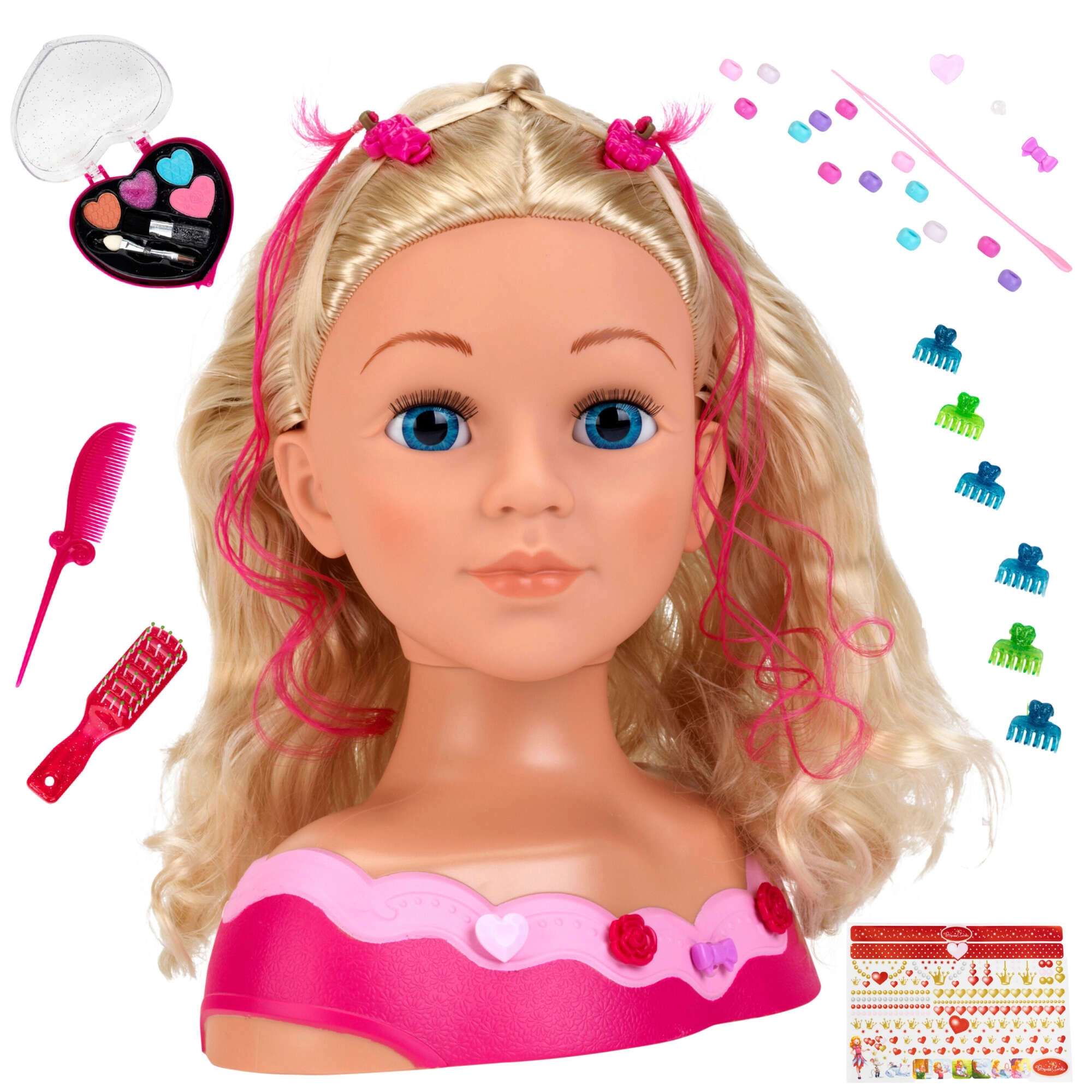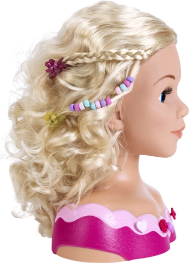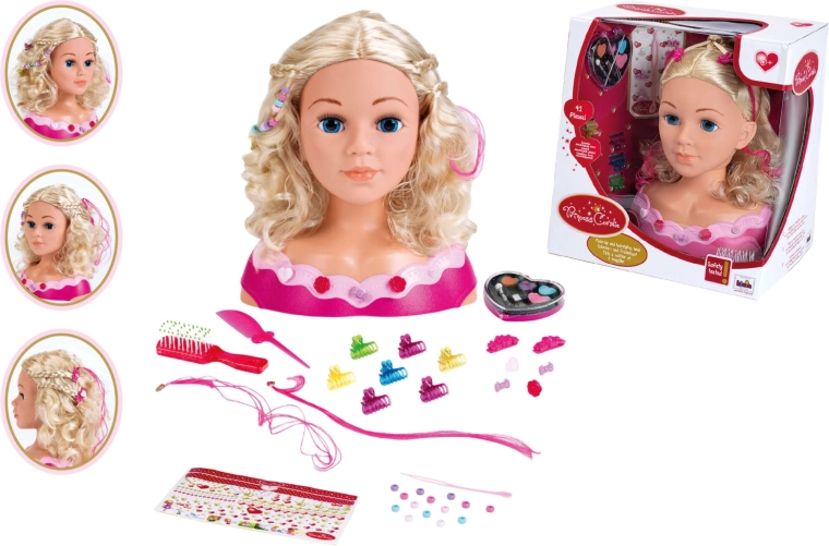 La tête à coiffer PRINCESS CORALIE ravira toutes les petites stylistes. Des cheveux réalistes, longs et faciles à coiffer, des yeux bleus et un socle rose stable garantissent un coiffage et un maquillage confortables et amusants. L’équipement généreux avec brosse, peigne, barrettes, perles et palette de maquillage pour enfants ouvre la porte à l’imagination.