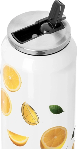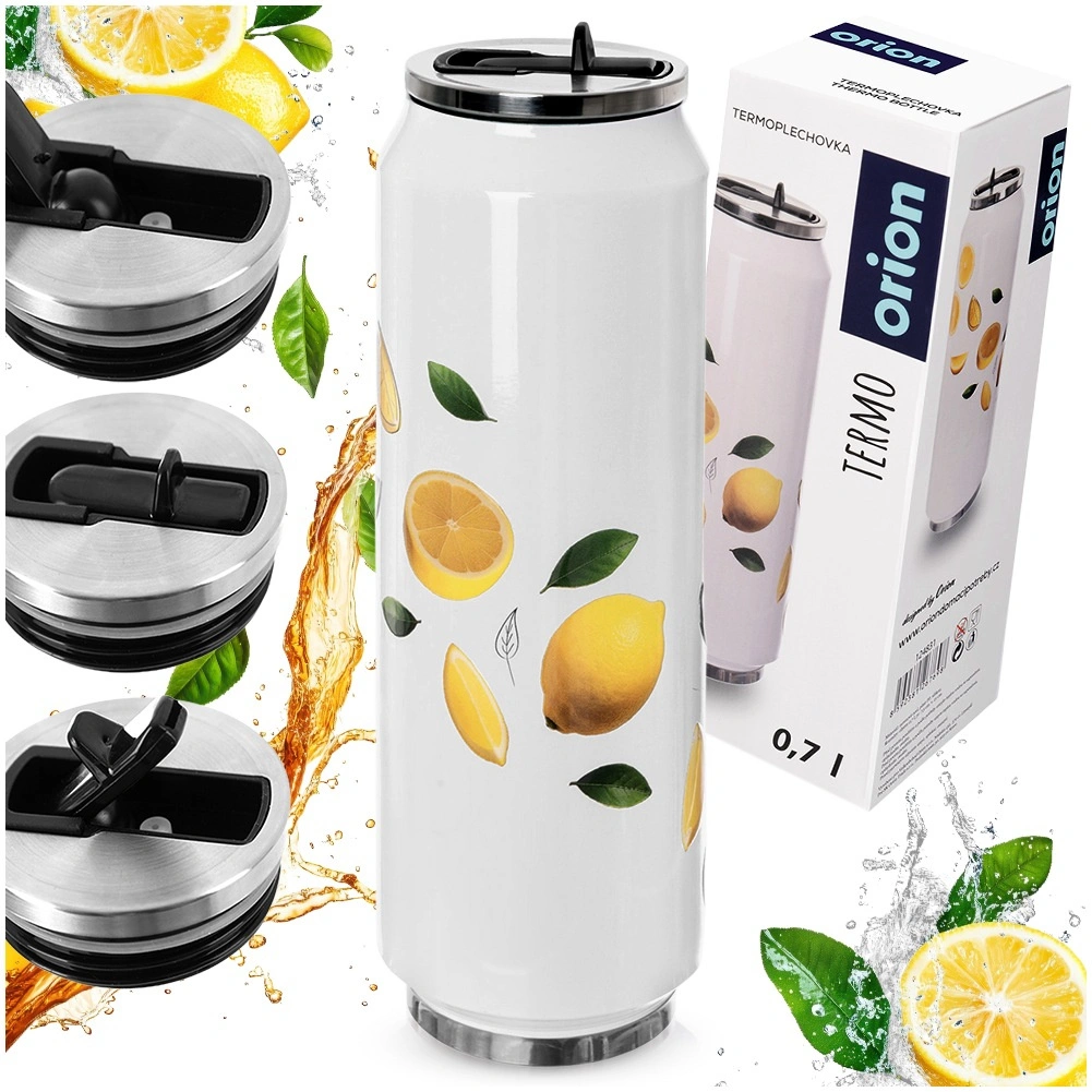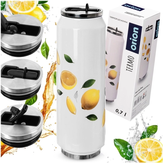 Un thermos stylé en forme de canette d'une capacité de 700 ml garde vos boissons chaudes jusqu’à 12 heures et froides jusqu’à 8 heures. Il possède une isolation sous vide à double paroi, une construction en acier inoxydable avec une surface blanche et un motif de citrons, un embout rabattable avec paille pour boire confortablement sans incliner, et un couvercle étanche contre les fuites en déplacement.