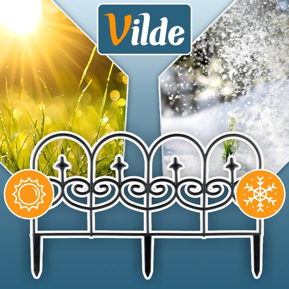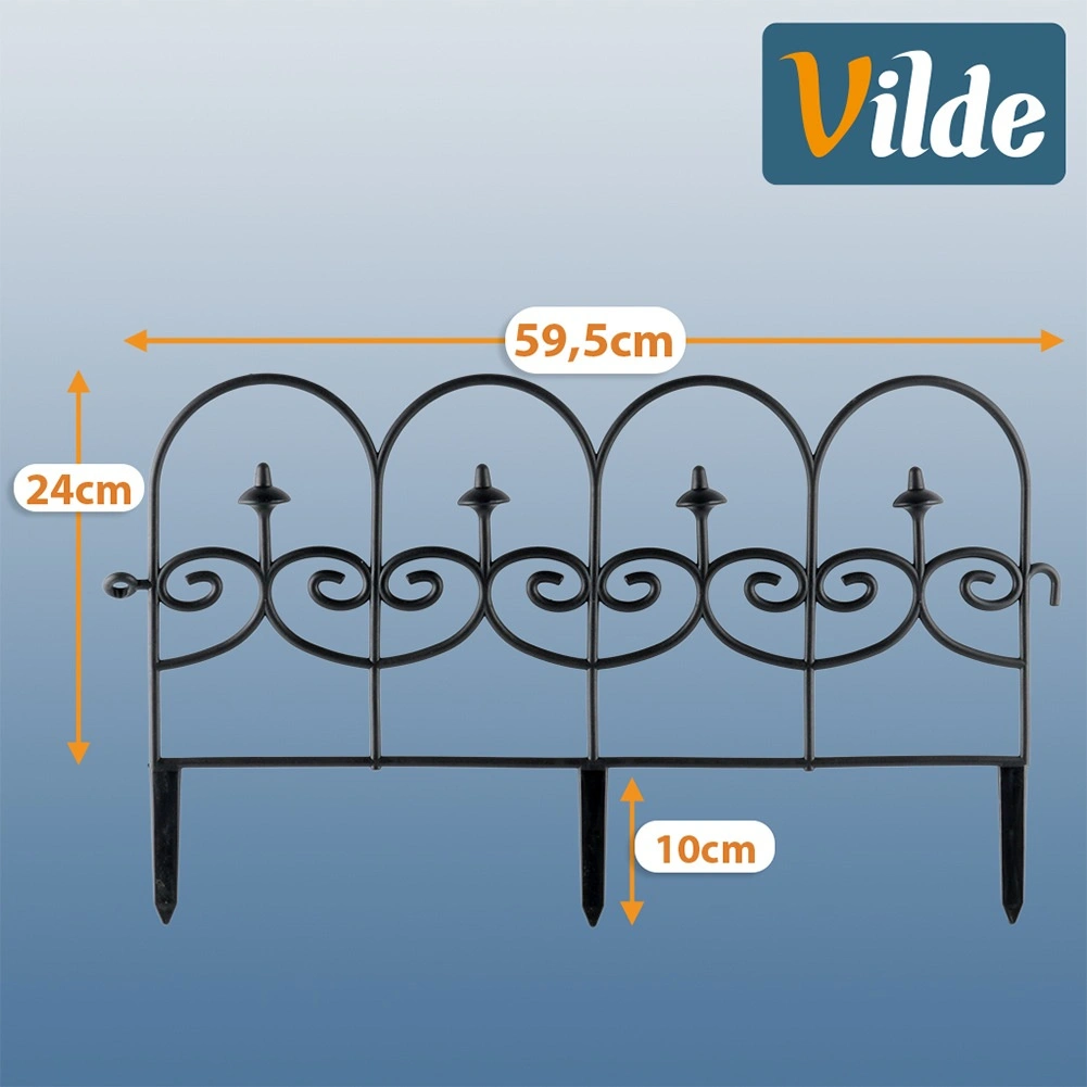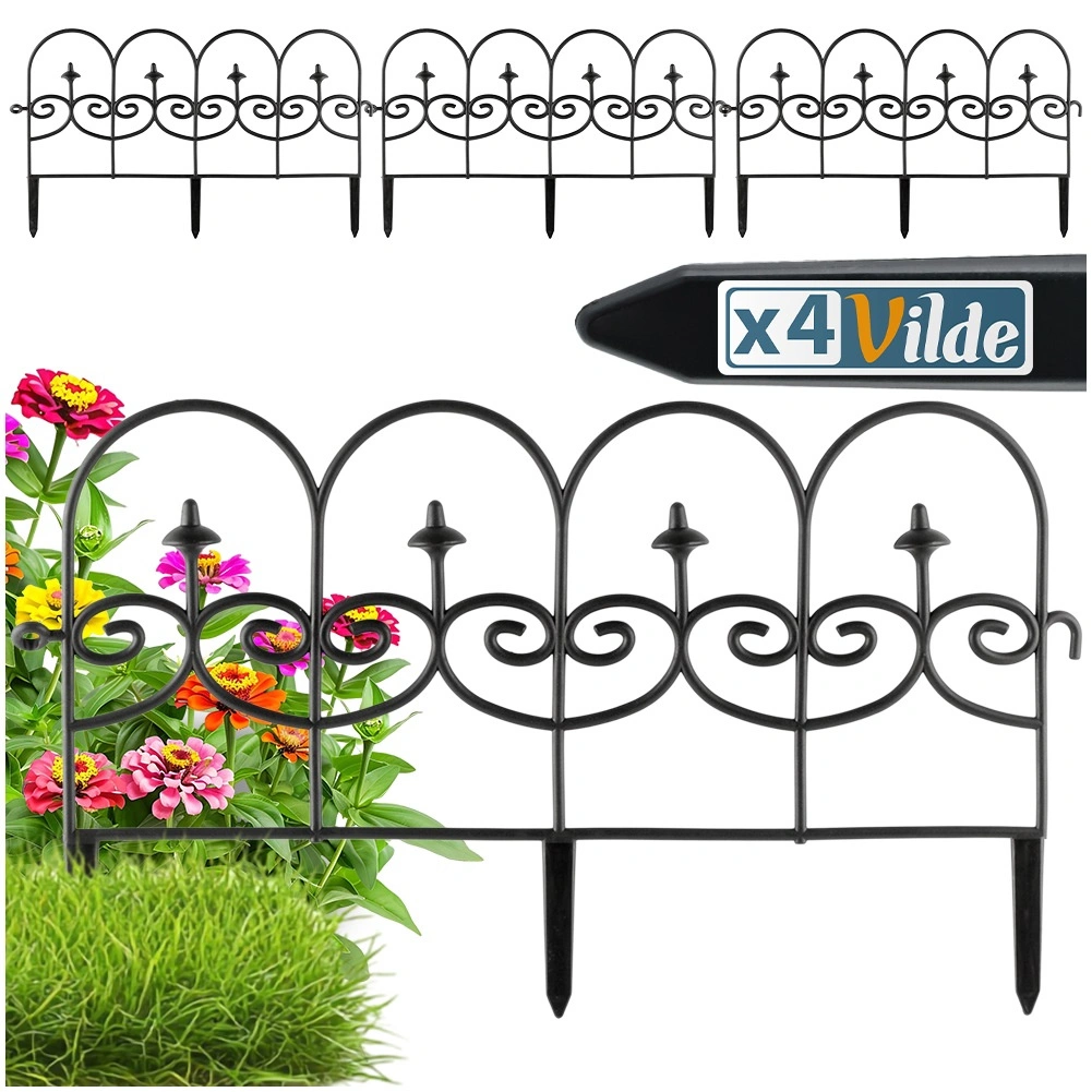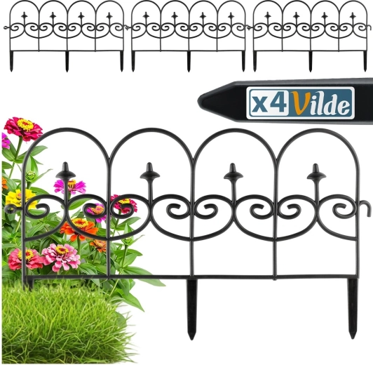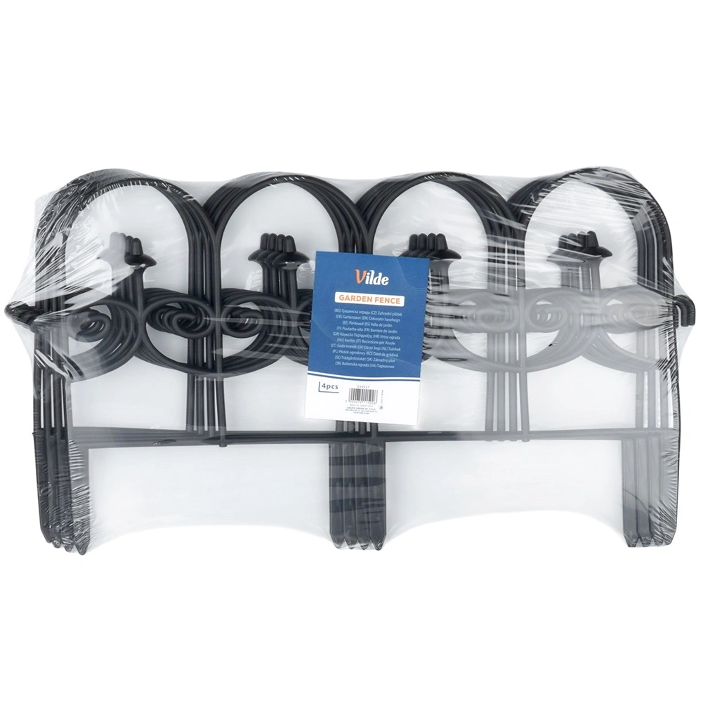Lot de quatre bordures décoratives de jardin noires permettant de séparer rapidement et proprement massifs, pelouse et allées. Chaque panneau mesure 59,5 cm de long et 24 cm de haut (34 cm avec ancrages), pour une longueur totale de 238 cm en ligne droite. Les bordures sont fabriquées dans un matériau résistant, s’installent facilement grâce à trois pointes d’ancrage et peuvent être librement connectées entre elles pour obtenir la forme et la longueur souhaitées. Grâce à leur résistance au gel, aux UV et à la pluie, elles conviennent à une utilisation toute l’année et garantissent des lignes nettes des massifs ainsi qu’une protection des plantes.