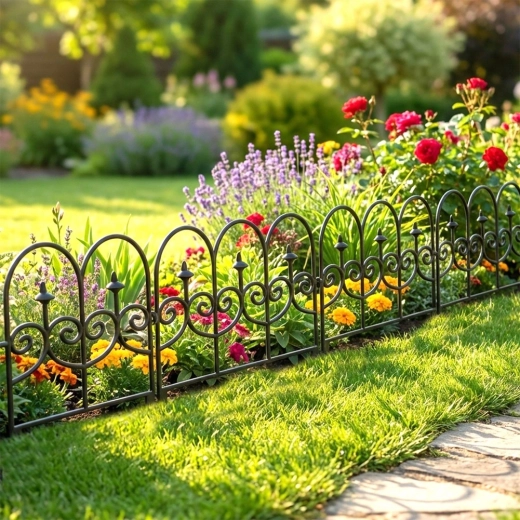 Les panneaux arqués au motif décoratif apportent du style au jardin tout en traçant une frontière claire entre la pelouse et les fleurs.