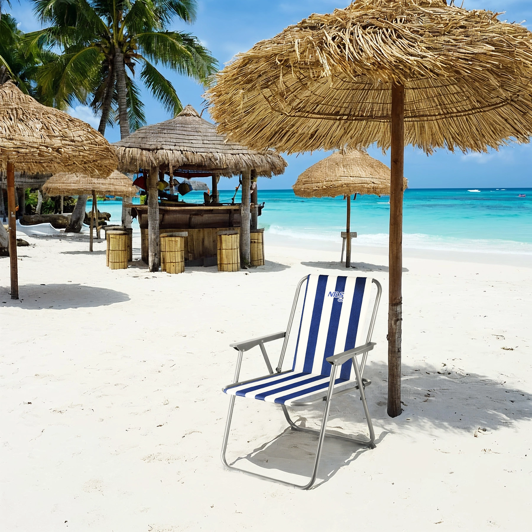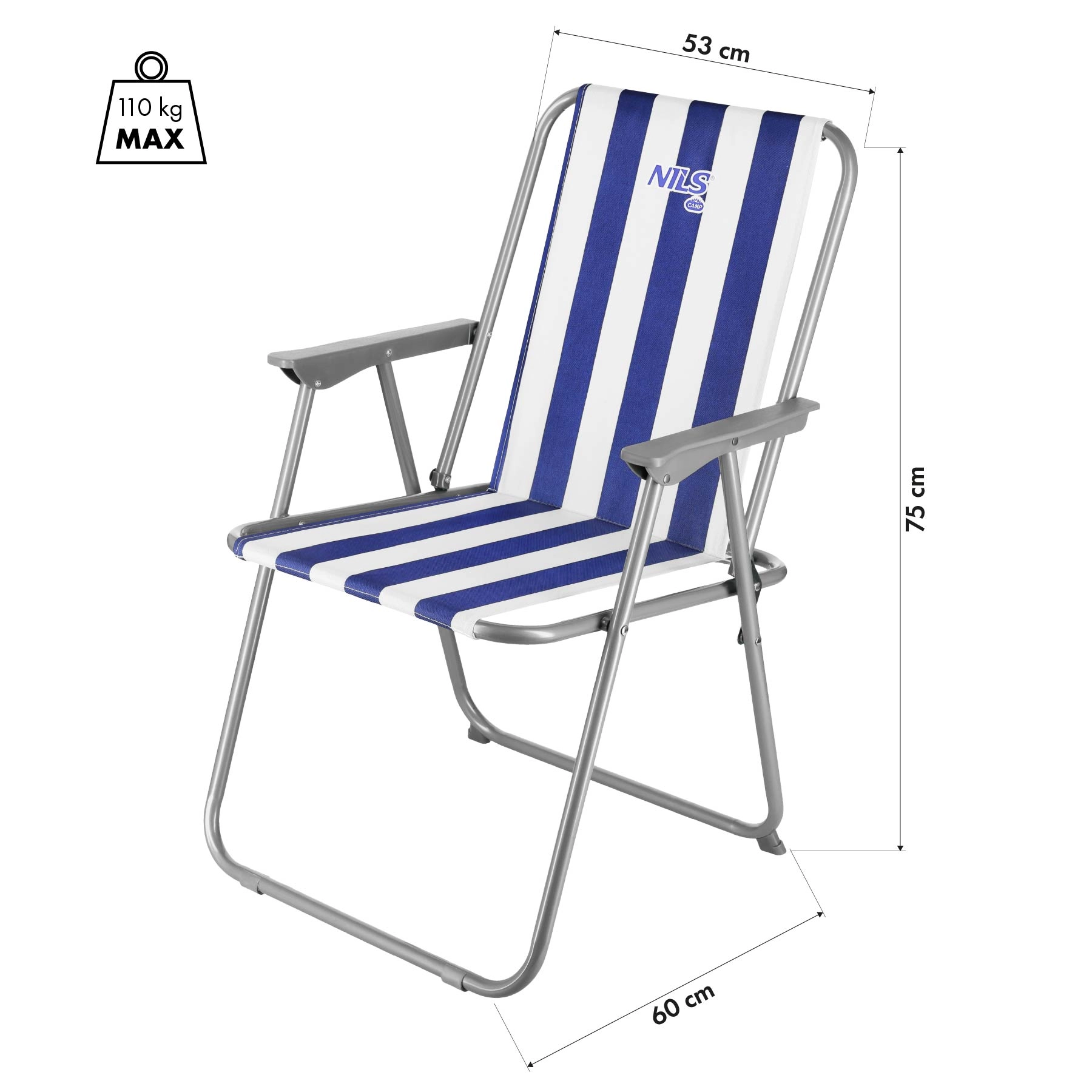 La chaise pliante NILS Camp à rayures bleu‑blanc est un compagnon pratique pour toutes les activités de plein air. Grâce à son cadre en acier, elle reste stable sur l’herbe, le sable et le pavé, tandis que le tissu Oxford 600D assure le confort tant pour une courte pause que pour une assise prolongée.