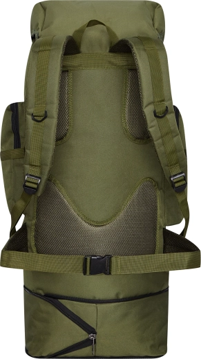 Grand compartiment principal avec cloison à cordon, cinq poches frontales et sangles supérieures et inférieures pour fixer un tapis de sol, une tente ou d’autres accessoires.