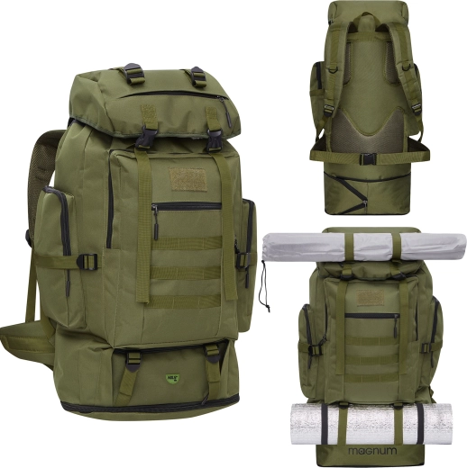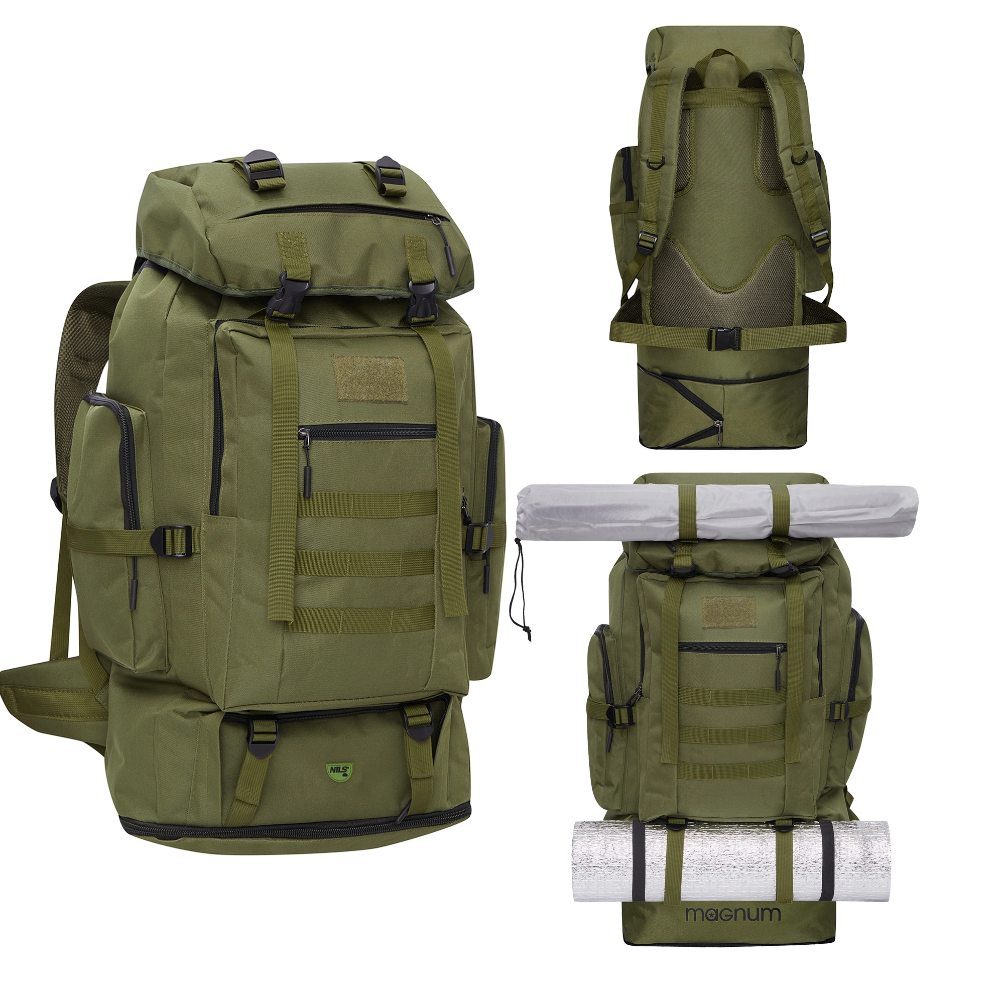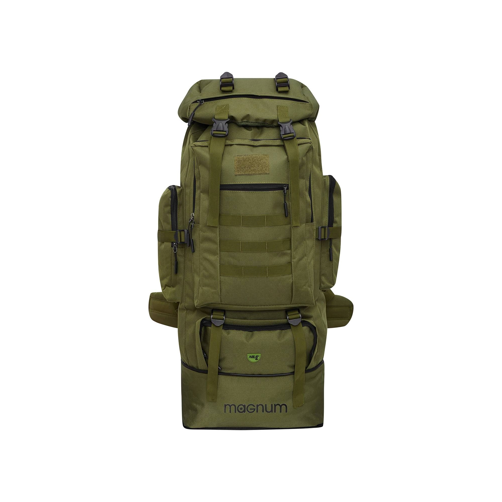 Pour un port confortable, le MAGNUM est équipé d’une ceinture lombaire et d’une sangle de poitrine réglables, de sangles de compression et d’un dos ventilé avec le Nils Vent System. Les sangles supérieures et inférieures permettent de fixer un tapis de sol ou une tente, tandis que le panneau frontal accueille des accessoires supplémentaires. Le tissu résistant 600D Oxford est facile d’entretien et offre une protection contre les éclaboussures.