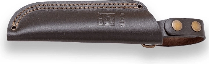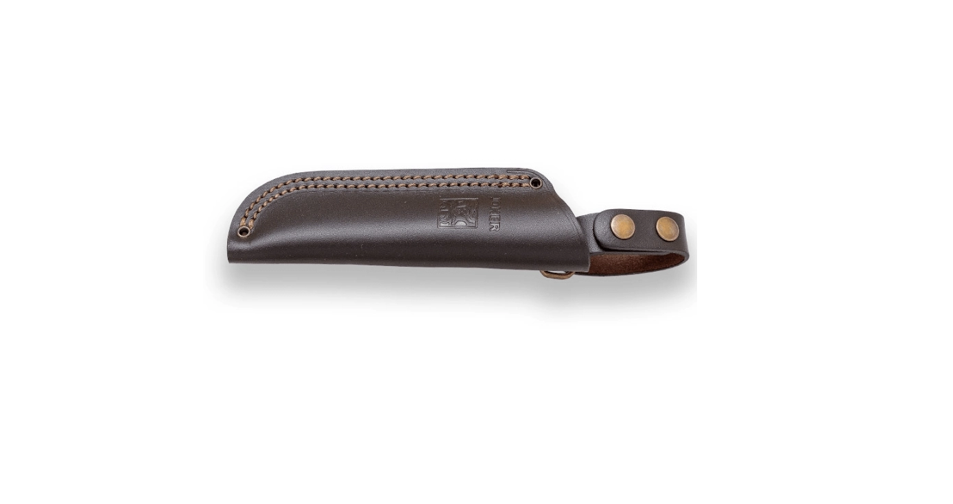 La construction full‑tang intégrale garantit solidité et longévité. Le manche en véritable bois de cerf assure une prise en main sûre, trois rivets augmentent la stabilité et le rivet creux terminal permet de passer une dragonne. L’étui en cuir facilite le port à la ceinture et protège la lame lors du transport.