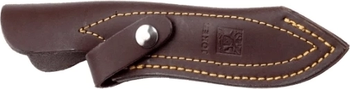 La construction full tang assure une grande solidité et stabilité à l’usage. La poignée en bois d’olivier tient bien en main et est dotée d’un trou pour dragonne à l’extrémité. L’emballage comprend un étui en cuir pour un port sûr et confortable à la ceinture.