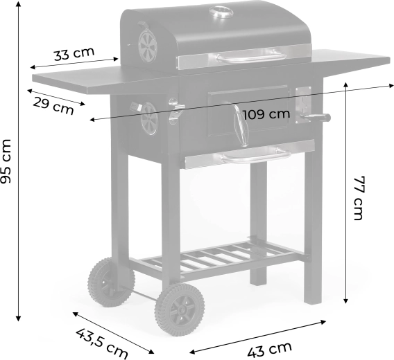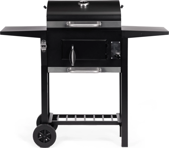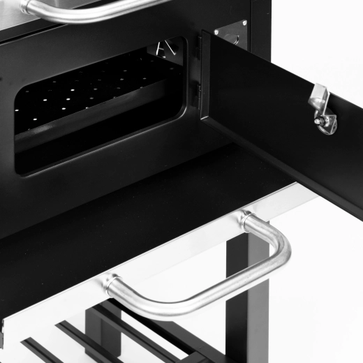 La grille principale 45×33 cm est complétée par une grille de réchauffage supérieure 38×19 cm pour garder les plats au chaud. Deux étagères latérales 33×29 cm offrent de la place pour les épices et accessoires, et la grille de rangement inférieure améliore l’organisation du travail. Grâce au tiroir à cendres, l’entretien est rapide et propre, et la porte avant du foyer facilite le rechargement du charbon pendant la cuisson.