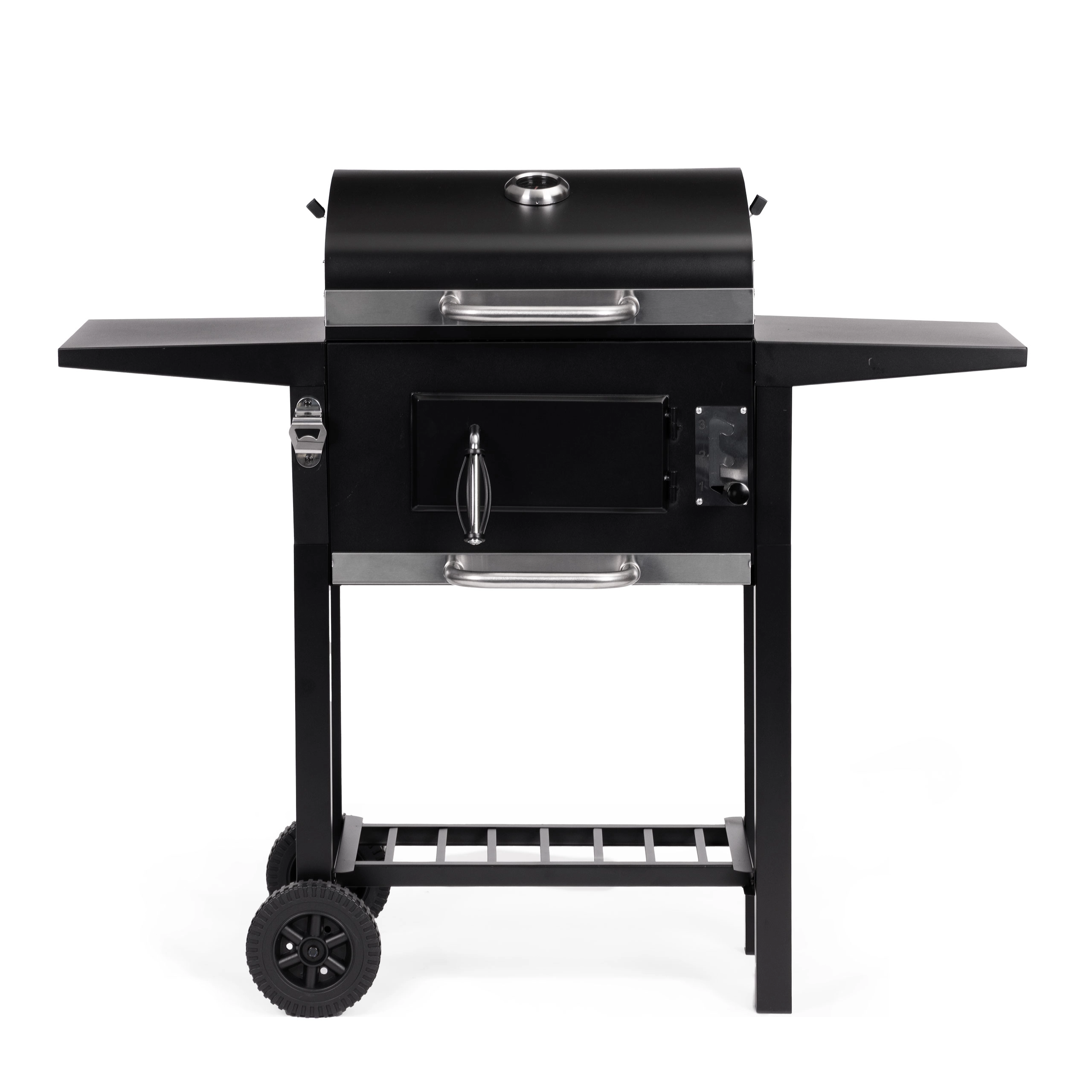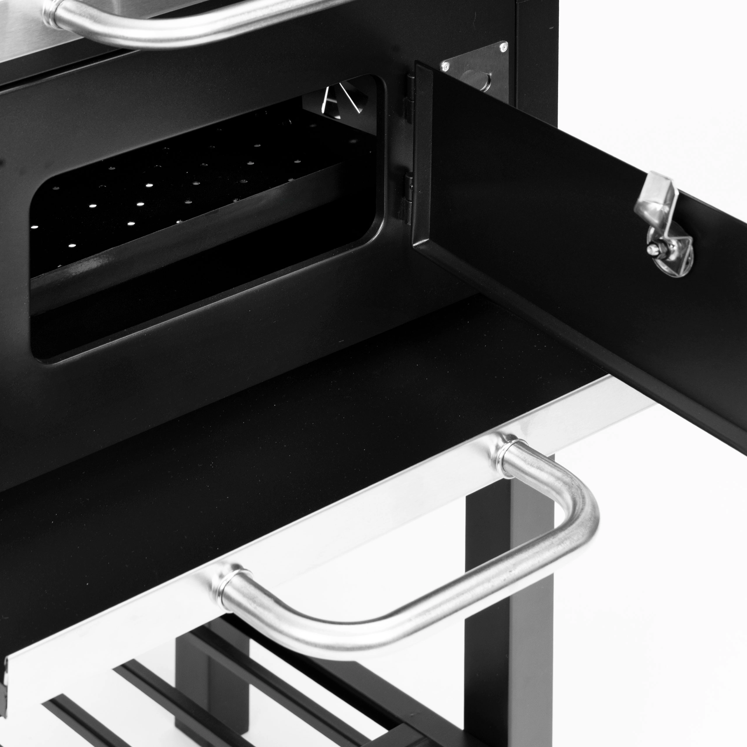 Tiroir à cendres pour un nettoyage rapide, porte avant pour recharger le charbon, deux étagères latérales et une grille de rangement inférieure pour une organisation parfaite.