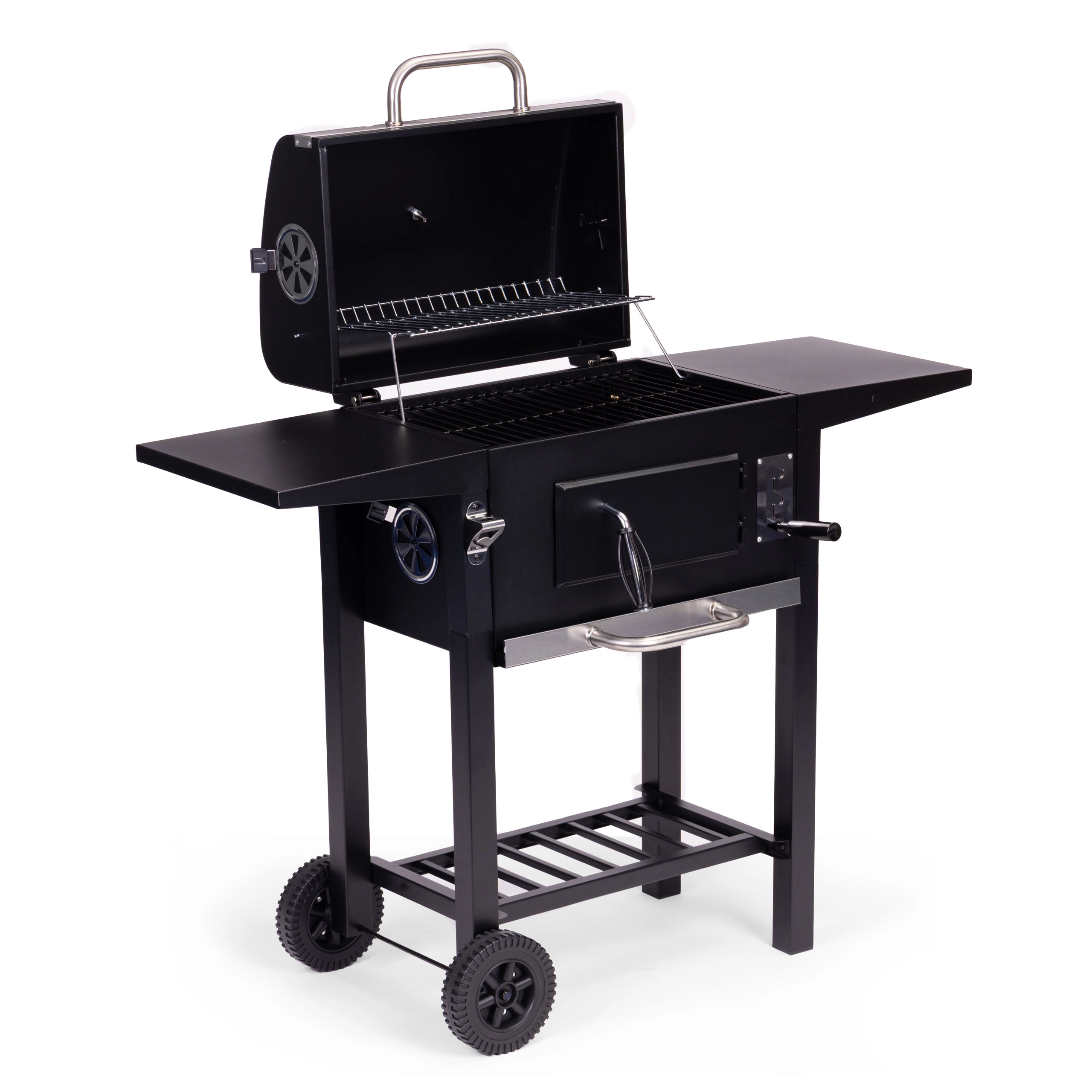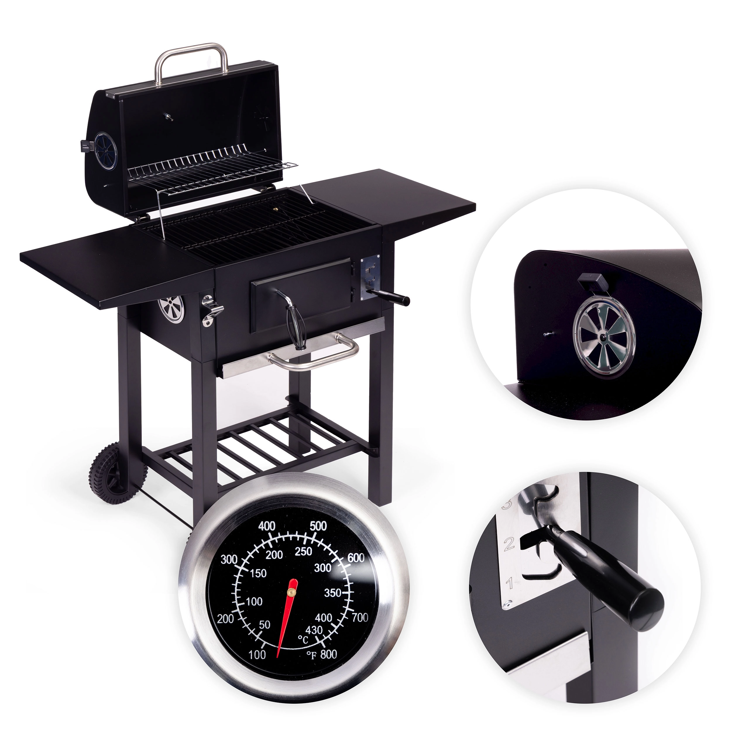 Avec le réglage de la hauteur de la grille sur 3 niveaux et les orifices de ventilation, vous régulez précisément la puissance – du saisissage vif au réchauffage délicat. Les roues de transport permettent de déplacer facilement le barbecue à l’endroit idéal. Le décapsuleur pratique est un agréable bonus pour des moments conviviaux en famille ou entre amis.