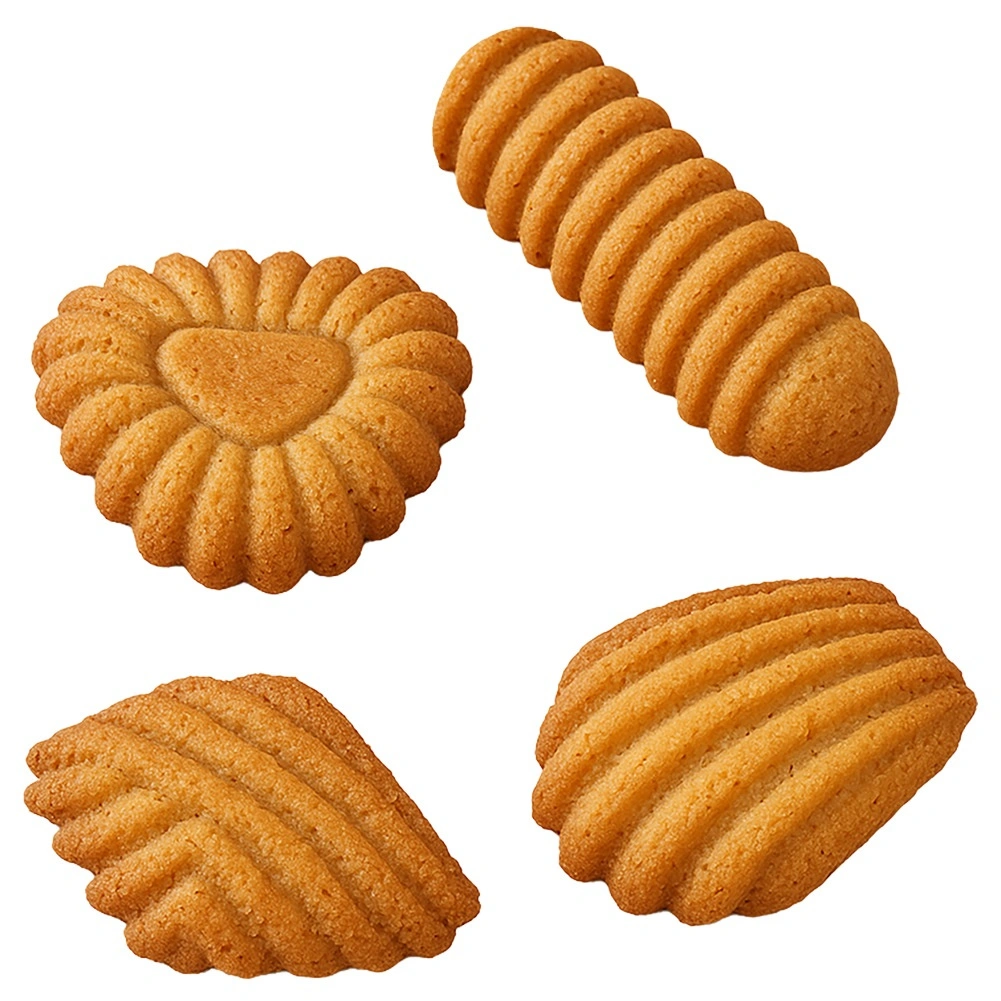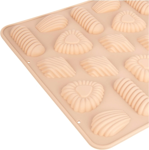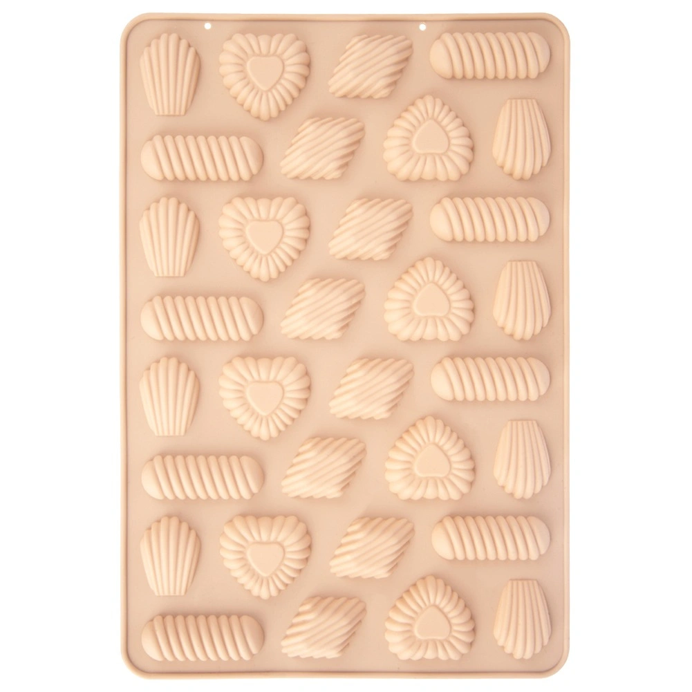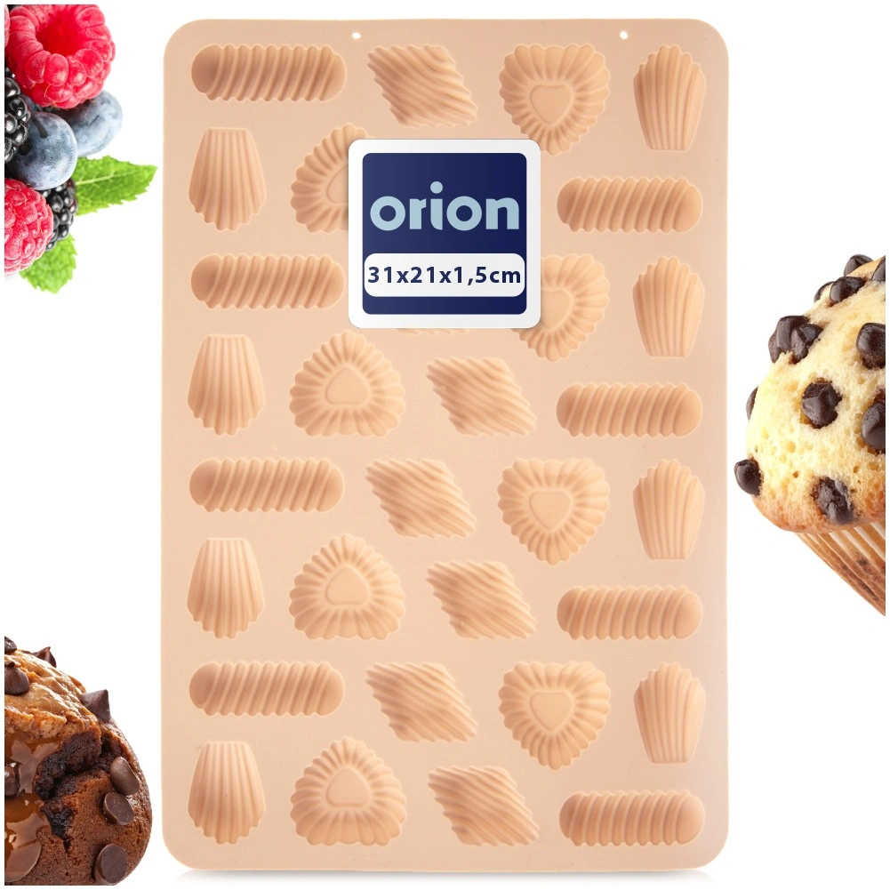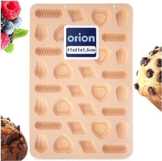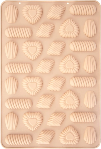 Moule en silicone pratique pour cuire jusqu’à 32 pièces de biscuits sablés, chocolats ou pralines en 4 formes décoratives. Fabriqué en silicone de qualité, flexible de couleur beige, avec une surface antiadhésive pour un démoulage facile sans graissage. Résistance thermique de -40 °C à +220 °C, compatible four, micro-ondes et congélateur, et lavable au lave-vaisselle. Produit original de la marque ORION.