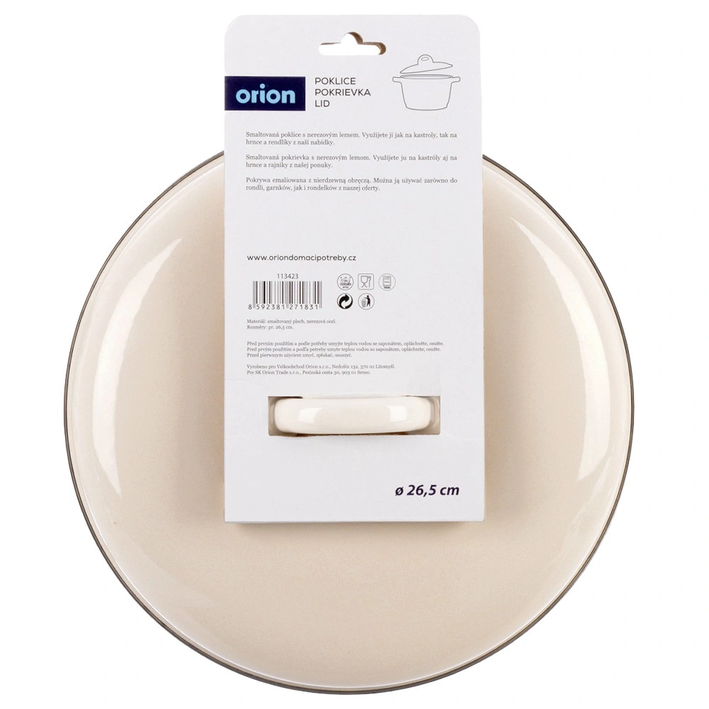 Couvercle universel émaillé de 26,5 cm de diamètre pour casseroles, poêles et sauteuses de même taille. Acier résistant avec revêtement émaillé de couleur crème, doté d’un rebord en acier argenté, conserve idéalement la chaleur, accélère la cuisson et économise l’énergie. Poignée centrale confortable pour une manipulation aisée. Compatible lave-vaisselle et pour couvrir les plats au four.
