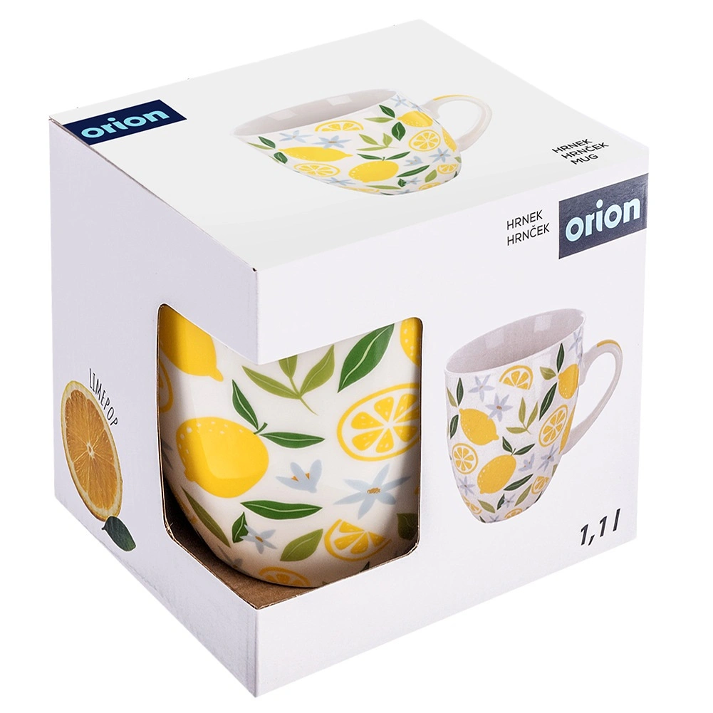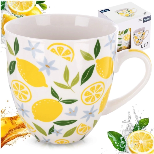 Grande tasse en porcelaine XXL d’une capacité de 1 L avec un motif joyeux de citrons, idéale pour le café, le thé, le cacao et les boissons froides. Elle possède une anse confortable, est compatible lave-vaisselle et micro-ondes et, grâce à sa glaçure en porcelaine de qualité, offre une longue durée de vie et un contact alimentaire sûr.