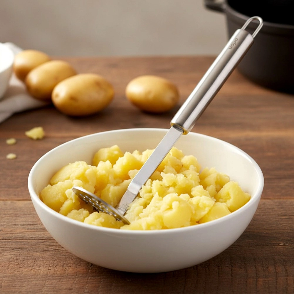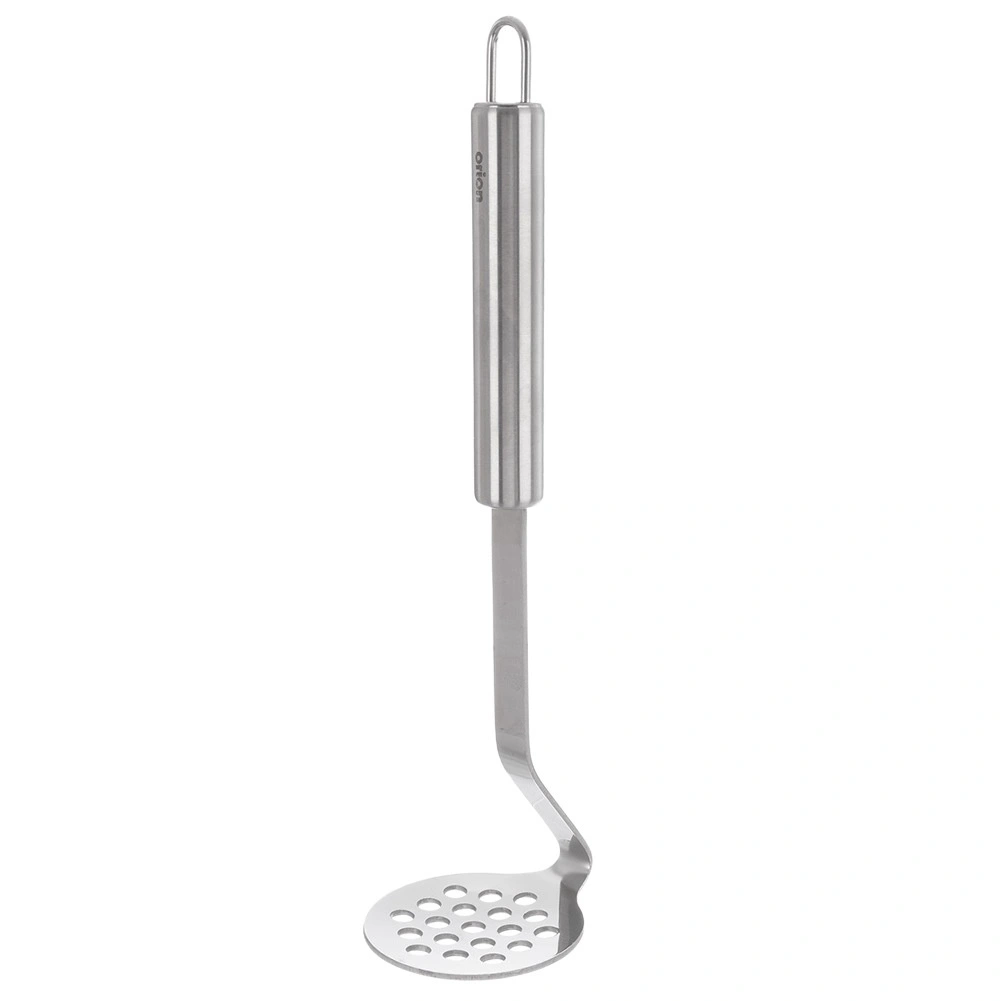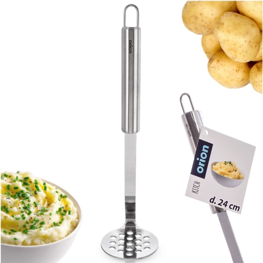Presse-purée pratique en acier inoxydable pour pommes de terre et légumes, doté d’une construction entièrement métallique stable et d’une poignée confortable. Grâce à sa longueur de 24 cm et à sa surface perforée de 6 × 6 cm, il prépare une purée lisse rapidement et sans effort. Acier inoxydable résistant, prise en main ergonomique et œillet de suspension pour un rangement facile. Produit original de la marque ORION.