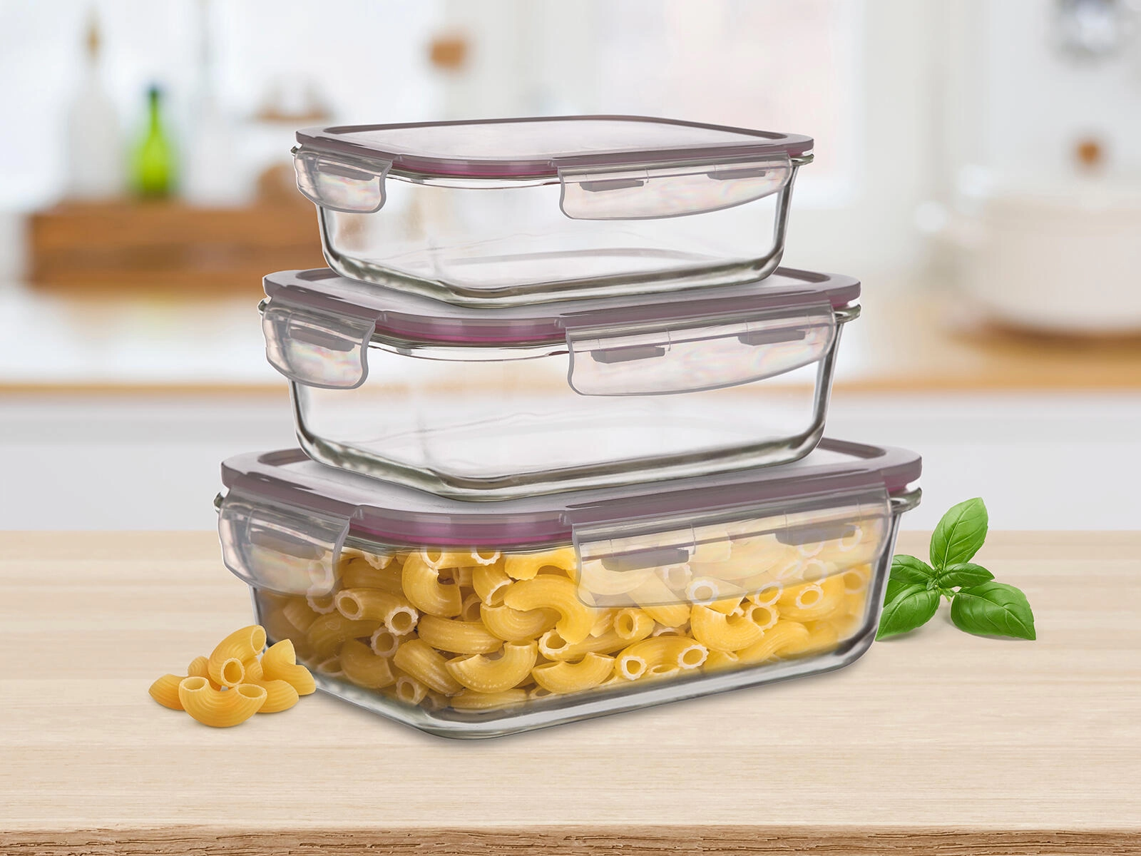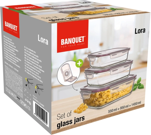Pratique ensemble de trois boîtes rectangulaires en verre Lora avec couvercles en PP transparents et joint bordeaux, pour conserver vos aliments frais plus longtemps. Les boîtes sont hermétiquement fermées, adaptées au congélateur, au four à micro-ondes et au four sans couvercle. Idéales pour le stockage, le transport et le réchauffage des plats.