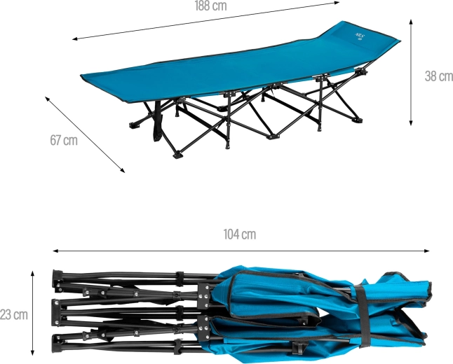 Compact une fois plié, pratique à l’usage. Le lit se replie aux dimensions 104 × 23 × 16 cm et, avec un poids de seulement 6 kg, se transporte aisément en voiture ou se range chez soi. La poche latérale pratique accueille téléphone, lampe frontale ou livre – tout reste à portée de main.