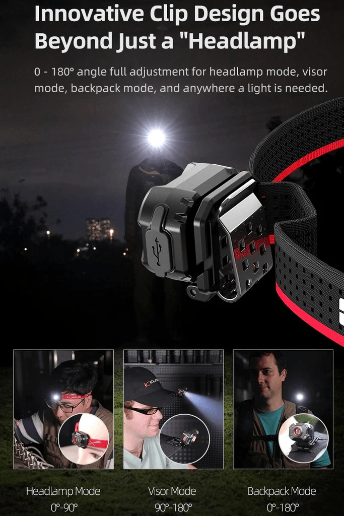 La recharge via micro‑USB est rapide et pratique : le témoin s’allume en rouge pendant la charge et en vert lorsque la charge est complète. Le clip innovant et le support rotatif permettent un réglage d’angle de 0–180°, afin d’adapter facilement l’éclairage à l’activité du moment, de la course au camping en passant par la pêche. La commande est intuitive : un seul bouton pour changer de mode, une double pression active le clignotement rouge.