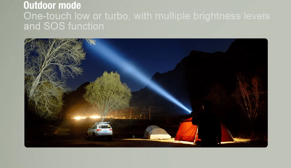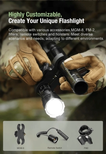 L’alimentation est assurée principalement par un accumulateur 21700/27100 5000 mAh 3,6 V offrant une autonomie jusqu’à 288 heures. La lampe est également compatible avec 1× 18650, 2× CR123A, 2× 16340 ou 2× 18350. Le corps robuste en aluminium aéronautique répond à la norme IPX8 et résiste à une chute de 1 m. Une LED latérale colorée indique l’état de la batterie (vert 100–70 %, orange 70–30 %, rouge ≤10 %). Un pas de vis 1/4" pour trépied est présent sur la tête.