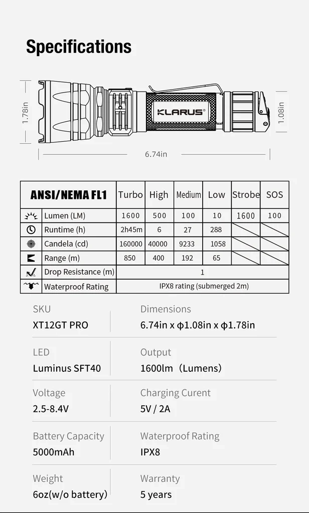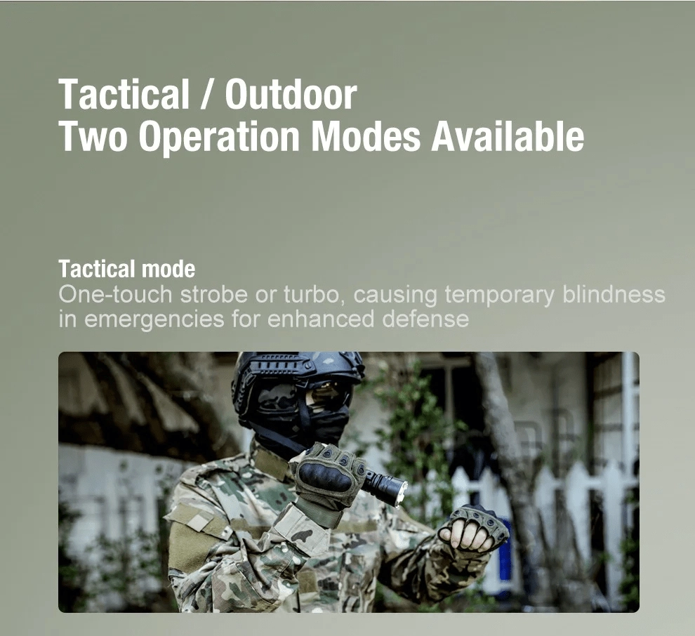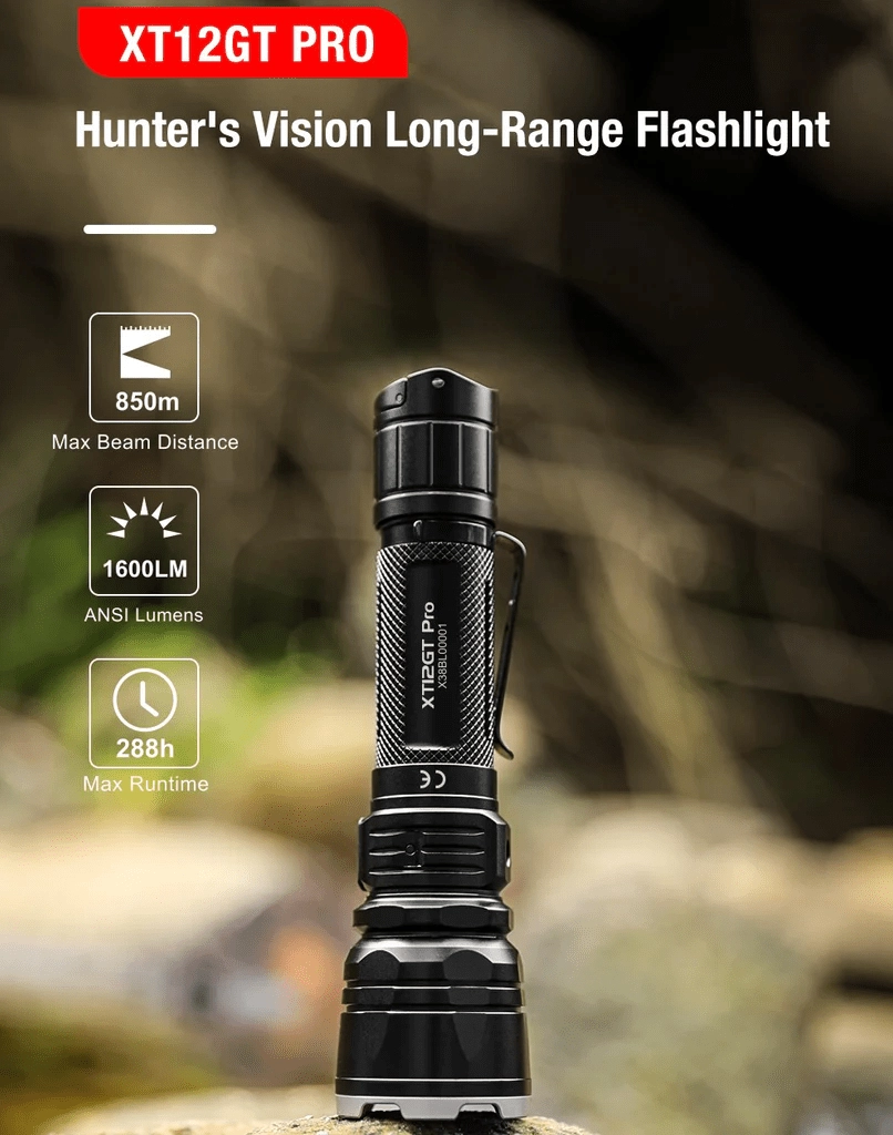 La KLARUS XT12GT Pro est conçue pour les utilisateurs exigeants qui nécessitent une portée fiable, un contrôle rapide et une grande robustesse sur le terrain. La lumière blanc froid 6500K de la LED Luminus SFT40 offre un faisceau directionnel précis pour la recherche à longue distance jusqu’à 850 mètres. L’interrupteur tactique arrière double permet un changement de mode éclair à une main, avec accès direct au TURBO, au STROBE et au SOS.