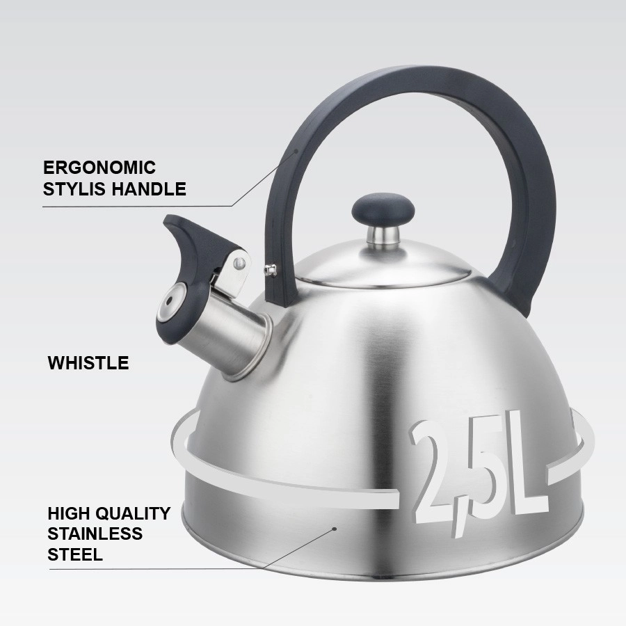 Bouilloire MAESTRO pratique et élégante en acier inoxydable de qualité, dotée d’un sifflet et d’une capacité de 2,5 l, pour faire chauffer l’eau confortablement pour toute la famille. Grâce à son fond capsule multicouche, elle chauffe rapidement et uniformément et convient à tous les types de plaques, y compris l’induction. Le couvercle amovible facilite le remplissage et le nettoyage.