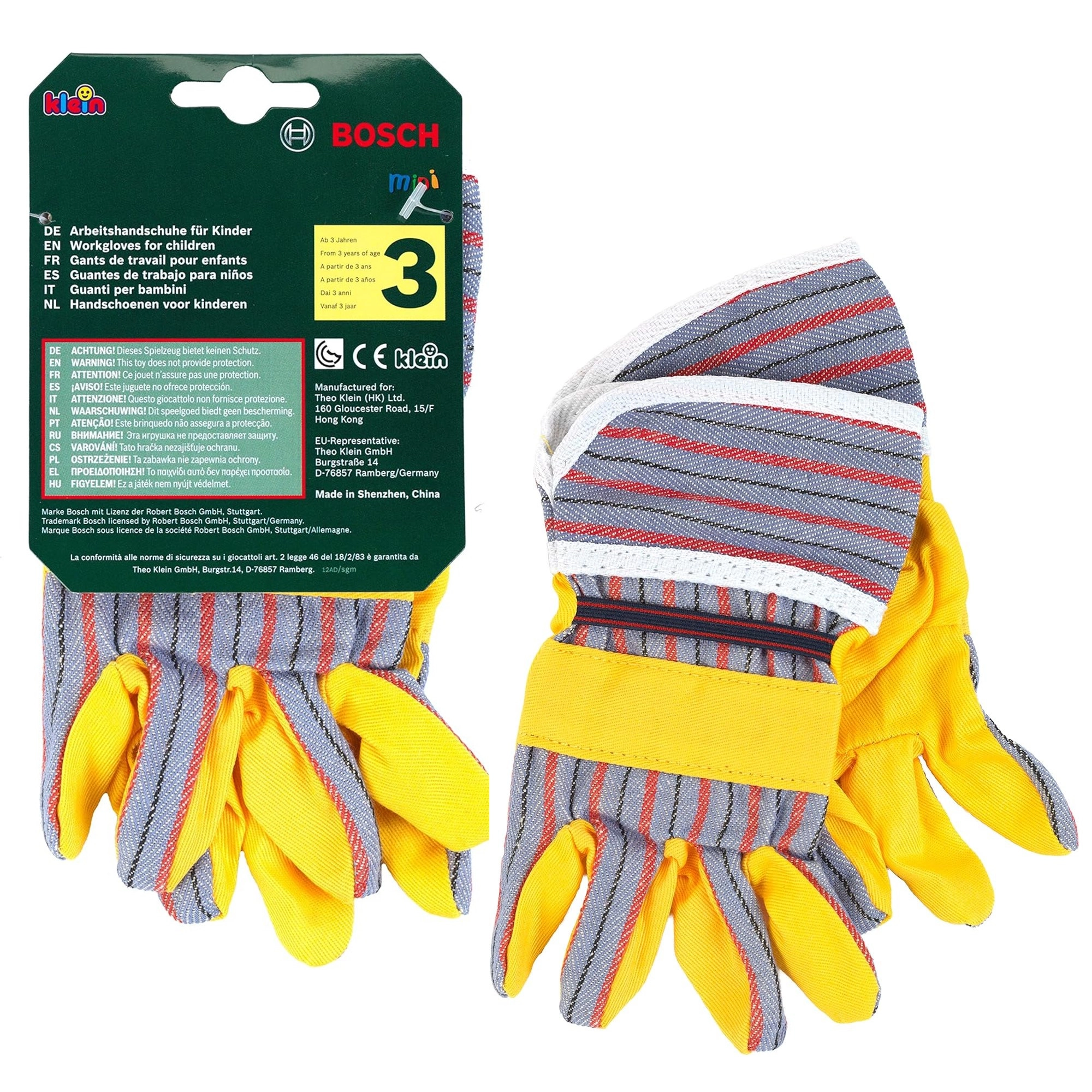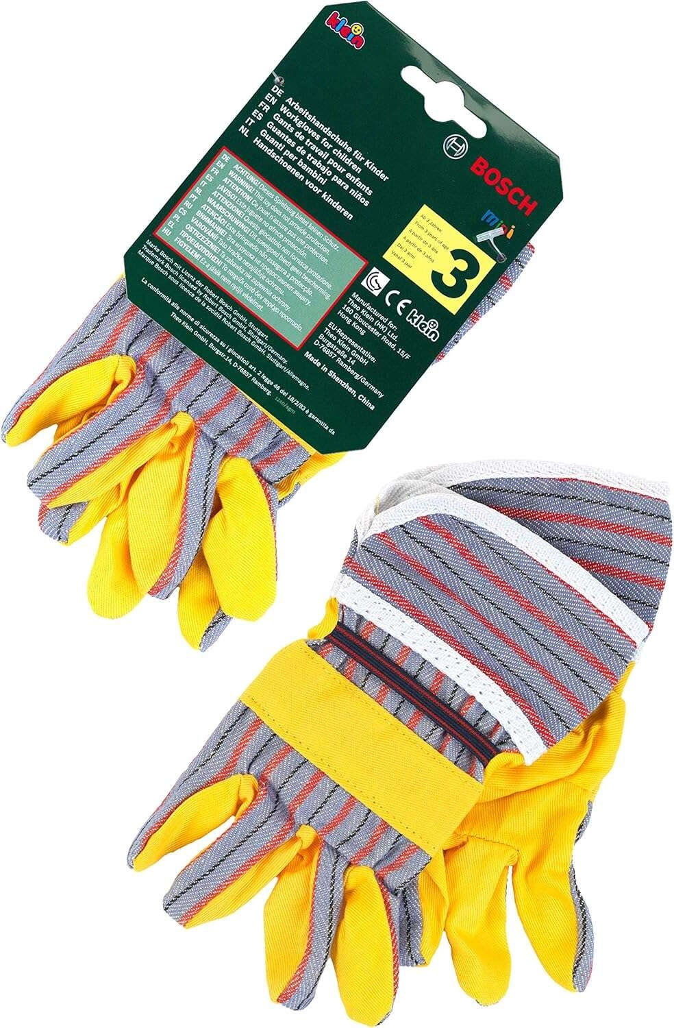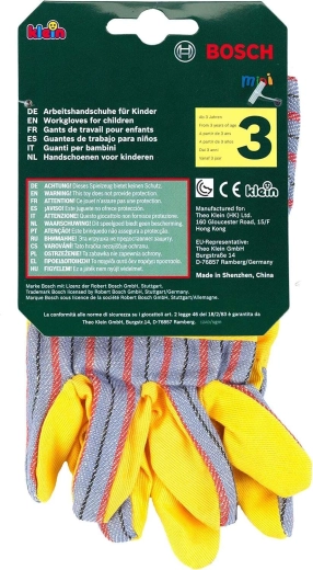 Les gants de travail pour enfants BOSCH de la marque Klein sont un excellent accessoire pour les petits bricoleurs. Ils reproduisent fidèlement de vrais gants, avec des paumes jaunes et des éléments rayés gris, des manchons élastiques pour une meilleure tenue et sont idéaux pour jouer aux artisans et aux jardiniers.