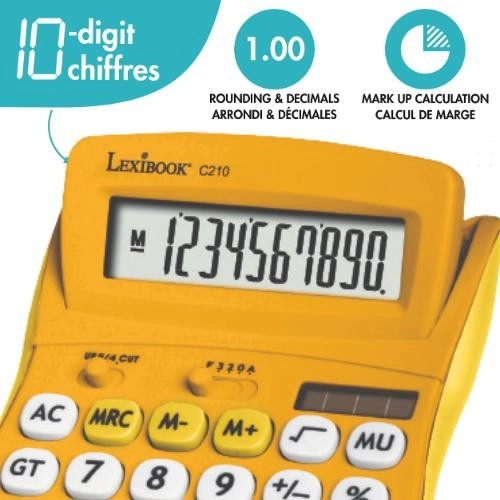 La calculatrice compacte LEXIBOOK se distingue par sa portabilité et sa conception résistante. Grâce à sa surface antidérapante en caoutchouc, elle tient bien en main et ne glisse pas. Son grand écran 10 chiffres assure une excellente lisibilité, même en conditions de faible luminosité.