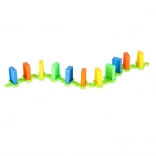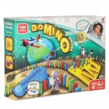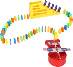 Contenu de la boîte : 126× pièces de domino (4 couleurs), 2× avions avec lanceur, éléments de piste, 2× billes, 1× figurine, 12× socles pour dominos, 52× autocollants éducatifs (lettres, chiffres, signes mathématiques).