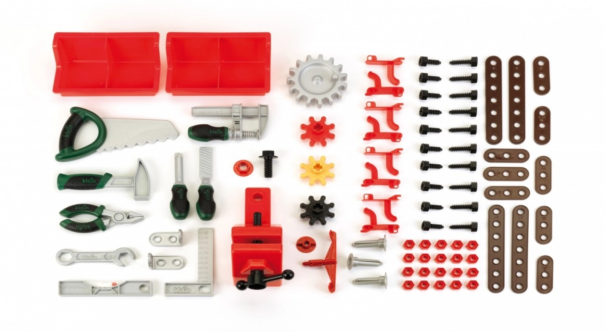 Un riche ensemble d’accessoires de qualité est inclus : tournevis plat et cruciforme, clé, niveau à bulle, pince et lime, ainsi que marteau, scie, équerre, vis, écrous et lattes de construction. Les enfants exercent de manière ludique leur motricité fine, leur coordination et leur pensée logique en assemblant les lattes et en vissant.