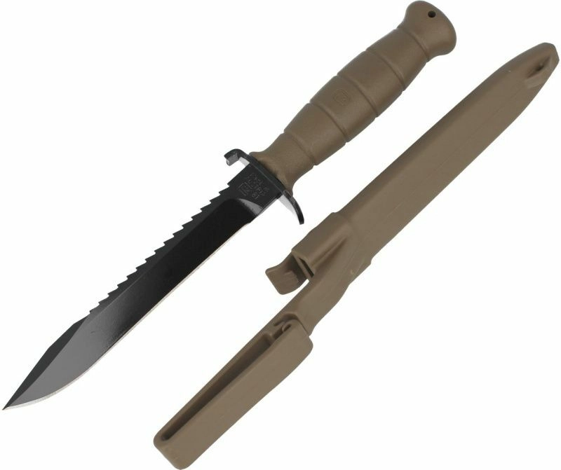 Le GLOCK FM81 Dark Earth est un couteau de type baïonnette, robuste et éprouvé dans des conditions exigeantes. La lame en acier à ressort au carbone pour outils, avec finition noire, minimise les reflets et augmente la résistance à la corrosion. La scie sur le dos facilite la coupe du bois et des plastiques, idéale pour la survie et le camping.