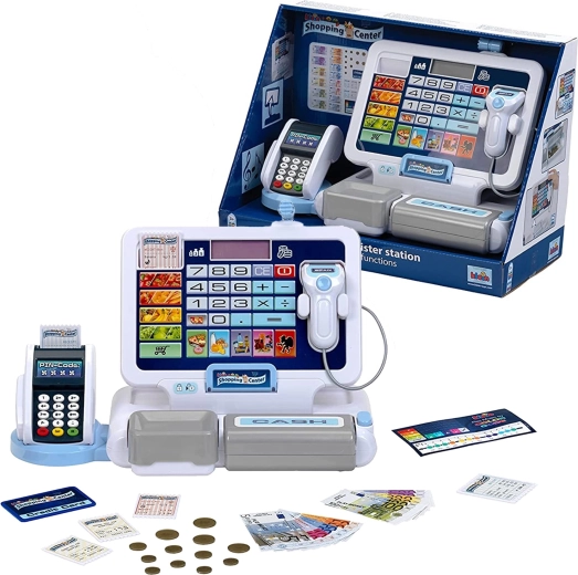 La caisse électronique pour enfants imite une vraie caisse : elle dispose d’un écran clair avec calculatrice, d’un lecteur de cartes, d’un scanner et d’un tiroir-caisse rabattable avec le célèbre « clic ». Les enfants peuvent « scanner » les articles, saisir les prix et laisser la caisse additionner automatiquement. Le design gris et blanc est moderne et épuré.
