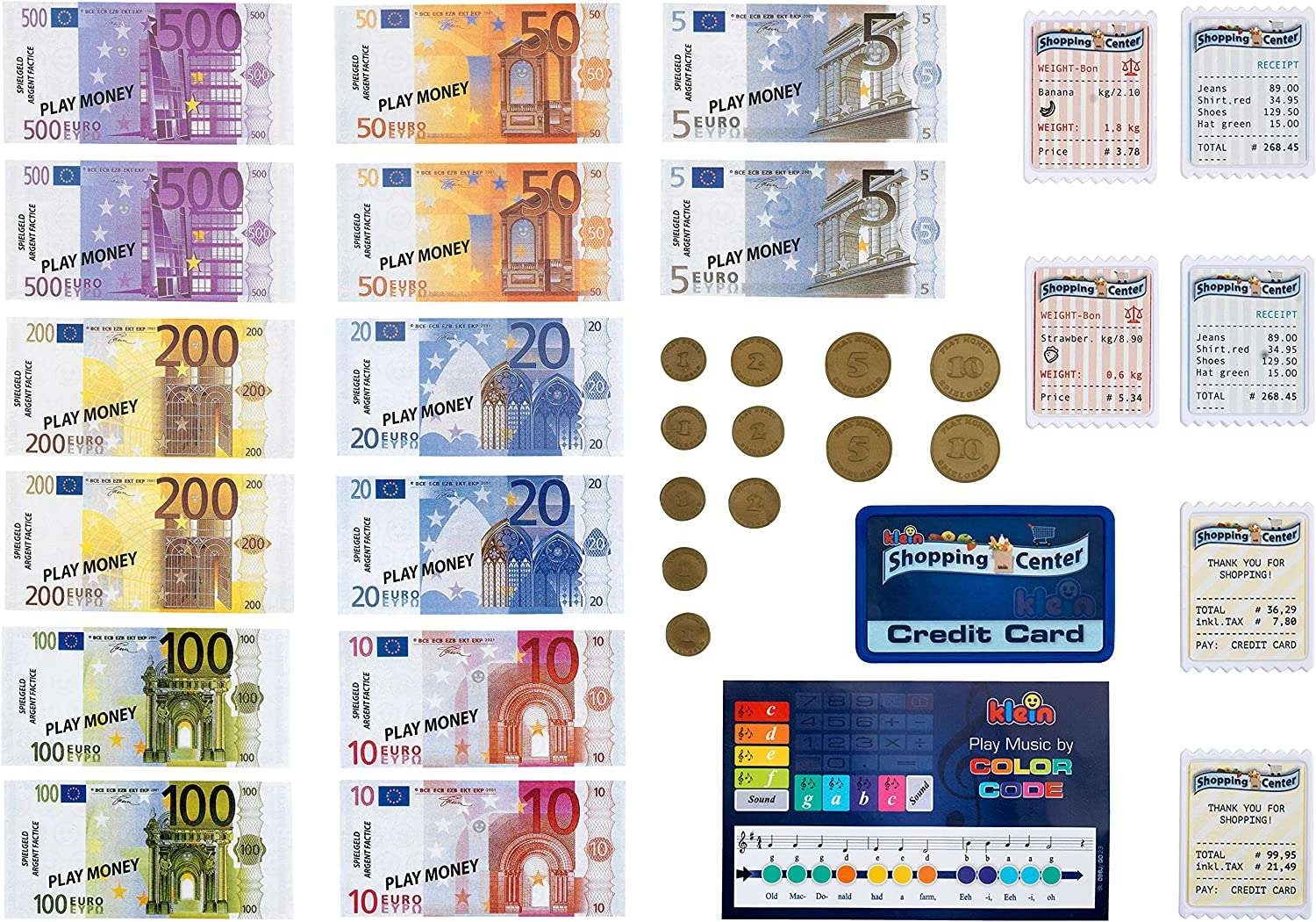 pièces en euros, billets (5–500 €), reçus, carte de paiement, carte avec chansons